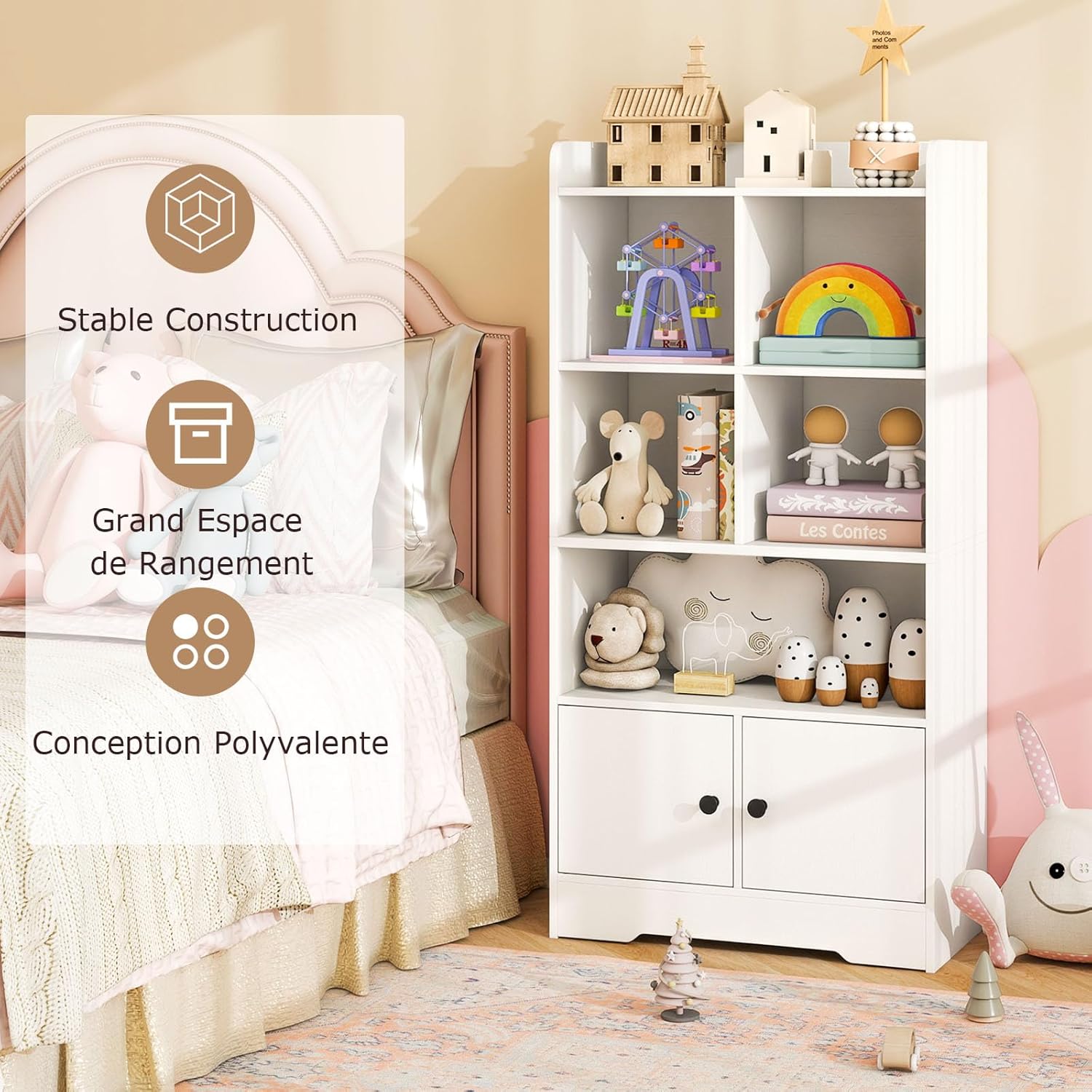 Doté d’une étagère supérieure spacieuse, de 5 compartiments ouverts et de 2 armoires avec portes pour répondre à divers besoins de stockage et d’exposition, cette bibliothèque en bois vous permet de garder vos livres, décorations, jouets et effets personnels bien rangés. En plus de ses fonctions de rangement, nous avons aussi pris soin de la sécurité du design : les matériaux de qualité assurent un soutien solide à la bibliothèque, tandis que le dispositif anti-basculement garantit encore plus de stabilité. Une étagère moderne qui allie fonctionnalité, sécurité et esthétique, idéale pour votre maison.