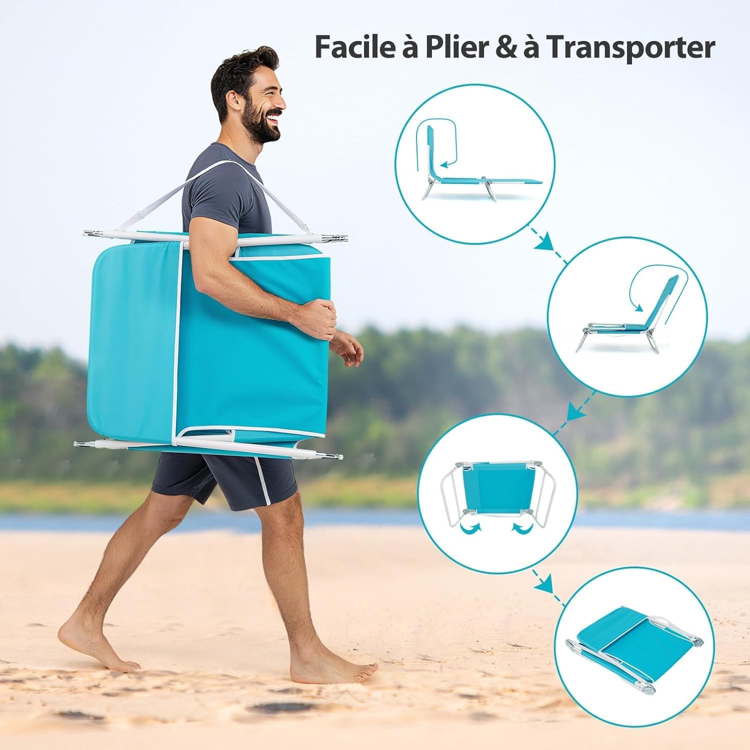 5 Positions Réglables: La chaise longue de plage dispose d’un dossier réglable, qui peut être facilement fixé à 5 positions avec un système de verrouillage. Qu’il s’agisse de lire, de se prélasser au soleil, de faire une sieste ou de s’allonger à plat, il peut répondre à vos besoins de confort dans différents scénarios.