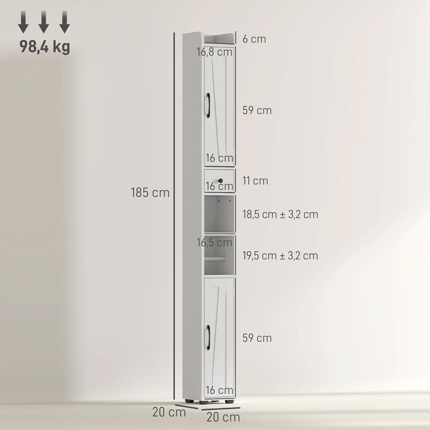 Couleur blanc Matériau panneau de particules Dim. totales 20l x 20P x 185H cm Dim. étagère supérieure 16,8l x 19P x 6H cm Dim. internes du placard 16,7l x 16,5P x 28,5/29,5H cm Dim. internes du tiroir 14l x 15P x 10H cm Dim. compartiment ouvert 16,5l x 18P x 18,5/19,5H cm Charge max. recommandée 98,4 kg (total), 13,6 kg (étagère), 3 kg (tiroir) Réf. 834-772V80WT