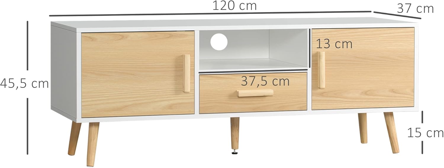 Couleurs blanc, naturel Matériaux panneau de particules, pin Dimensions totales 120l x 37P x 45,5H cm Dim. interne placard 38l x 37P x 27H cm Dim. compartiment ouvert 37,5l x 39P x 13H cm Hauteur pieds 15 cm Charge max. recommandée 50 kg (au total), 40 kg (plateau), 5 kg (étagère), 3 kg (tiroir) Réf. 839-139ND Note Si vous souhaitez la reprise de votre ancien produit, merci de consulter nos CGV sur les modalités de reprise et de nous joindre via la messagerie. Contenu du colis 1 x Meuble TV; 1 x Notice de montage
