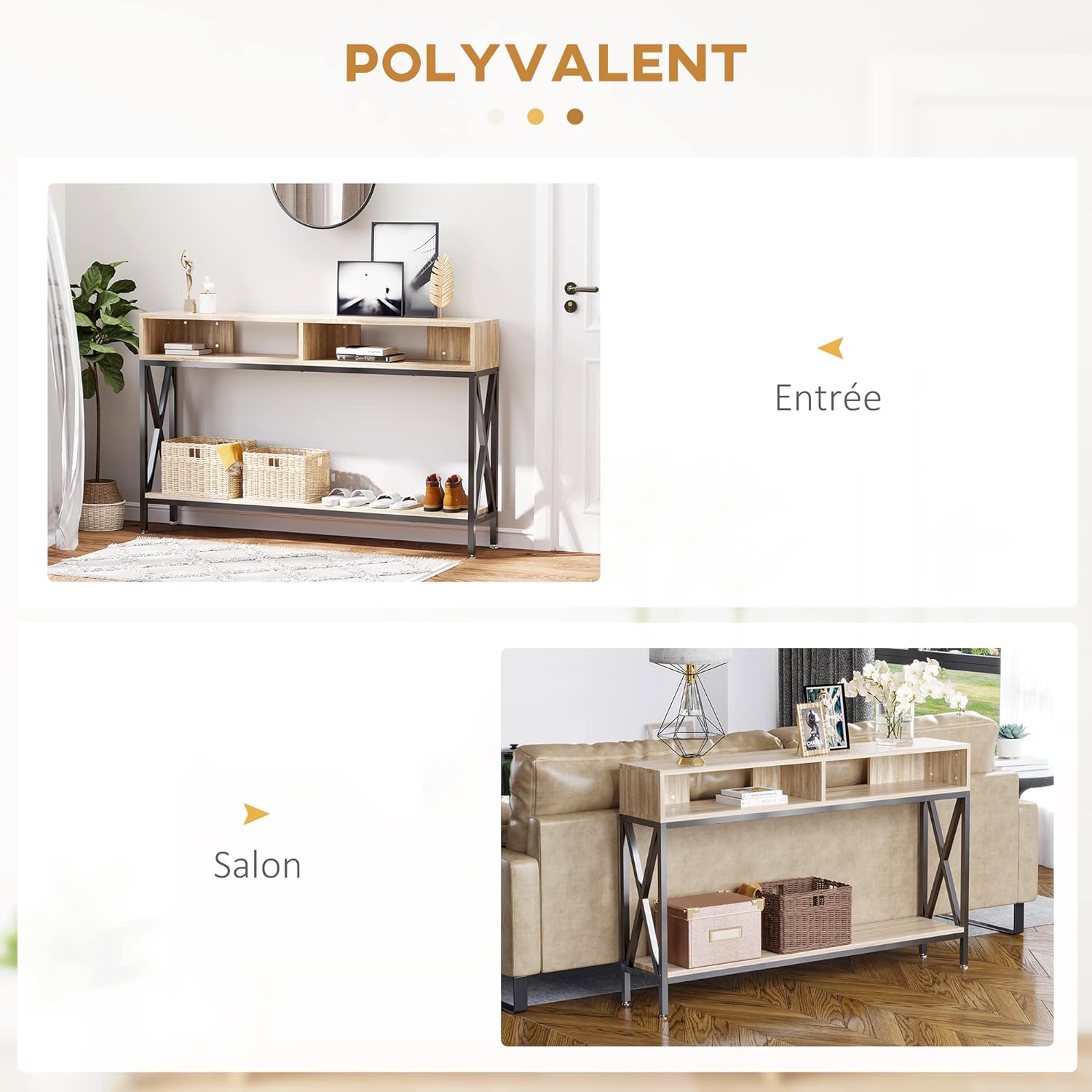 SOLUTION DE RANGEMENT : en plus de plateau de la table, cette table console comporte également les plateaux spacieuses pour vos objets personnels et une étagère stable en bas où vous pouvez ranger vos chaussures ou y poser les sacs de rangement supplémentaires.