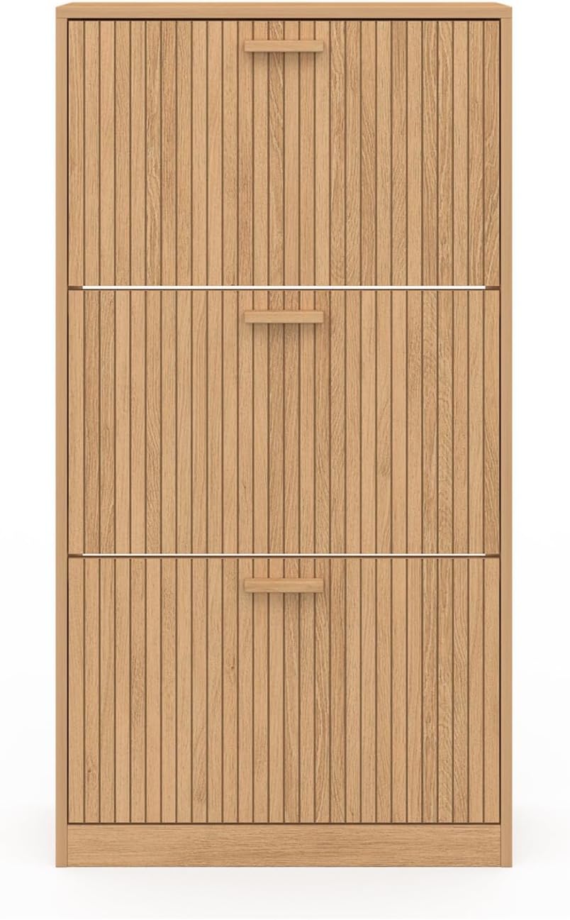 Derrière les 3 portes battantes de ce meuble d’entrée, chaque compartiment est séparé par une cloison, permettant ainsi de disposer jusqu’à 6 paires de chaussures par niveau. Un espace bien organisé, où chaque membre de la famille aura droit à son compartiment dédié !Avec seulement 24 cm de profondeur, ce meuble à chaussures au format ultra compact est mis sur une conception verticale afin d’optimiser l’espace sans l’encombrer. Ses portes battantes, aussi pratiques qu’élégantes, s’ouvrent facilement grâce à leurs poignées au design soigné.Parfaitement adapté à une entrée, un couloir, un dressing ou même une buanderie, il s’intègre naturellement à tous les styles d’intérieur. Son design moderne et chaleureux, sublimé par l’effet latte tasseau bois très tendance, apportera une touche déco chic tout en discrétion à votre pièce.Conçu en panneaux de particules de bois, il allie robustesse et stabilité. Finis les chaussures qui traînent : optez pour un intérieur bien rangé et accueillant grâce à ce meuble à chaussures aussi esthétique que fonctionnel !Dimensions du meuble chaussures JULIETTE Dimensions globales : Longueur 60 x largeur 24 x Hauteur 113 cmDimensions des portes : L. 56.5 x l. 24 x H. 34.5cmDimensions poignées : L. 10 x P. 2 x E. 1.5 cmMatériaux : Panneaux de particules 12/15 mm et MDFPointure allant jusqu’au 41 Coloris : boisÀ monter soi-mêmeRetrouvez l’ensemble de notre collection contemporaine sur notre boutique en ligne !