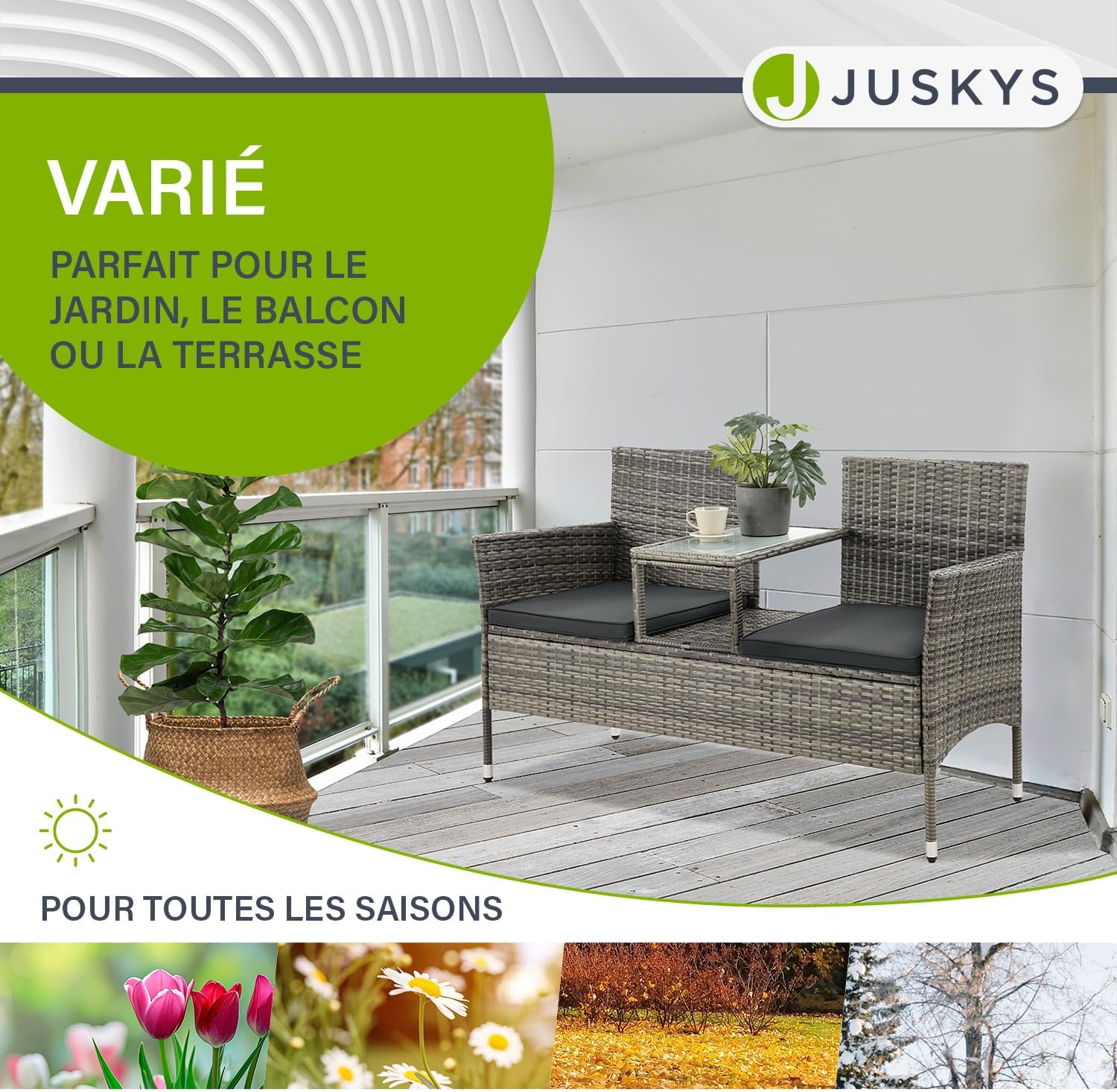 Salon de jardin en polyrotin avec table intégrée – Idéal pour balcon, terrasse, étang de jardin ou jardin d’hiver – Plateau de table en verre de sécurité intemporel et moderne – Armature en acier robuste – Résistant aux intempéries et aux UV – Coussins d’assise confortables faciles d’entretien – Housses lavables.