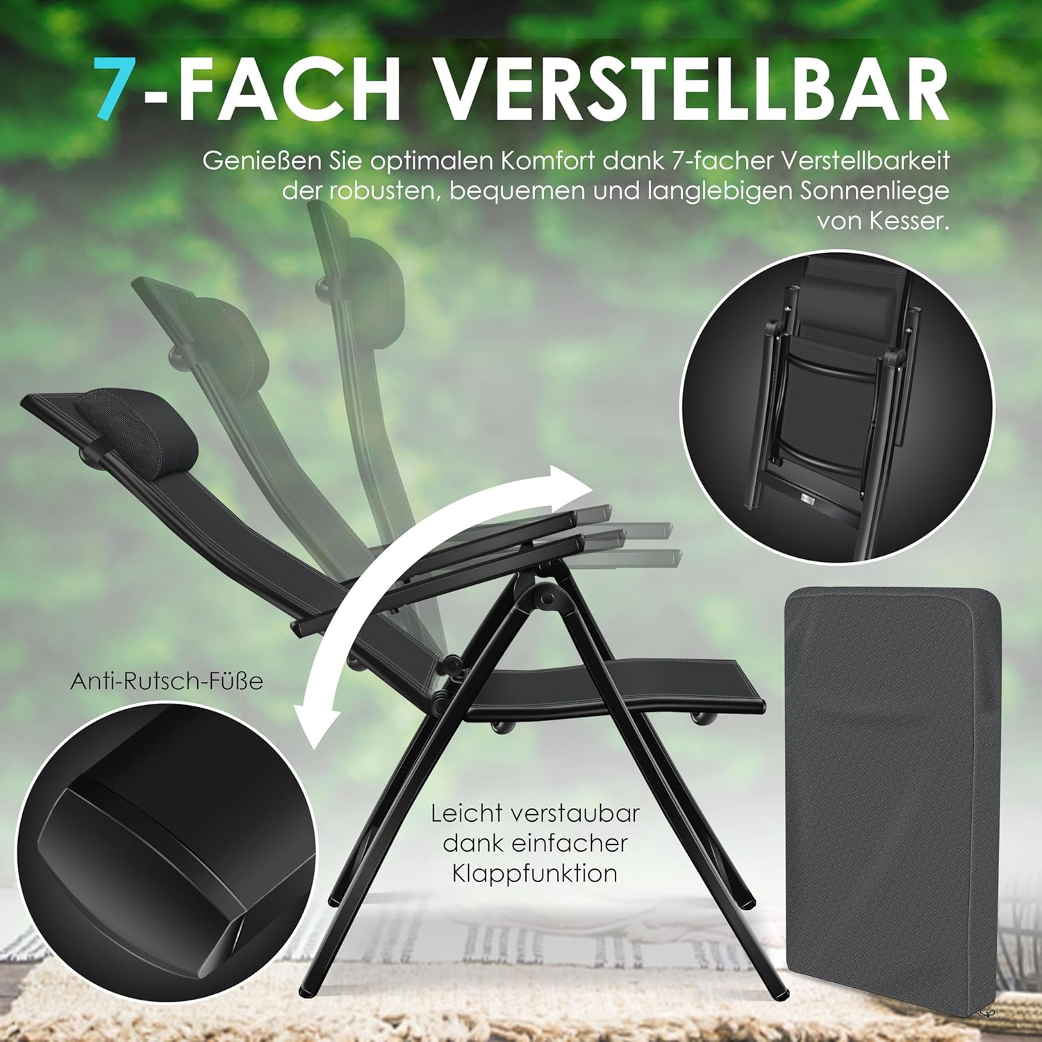 𝐂𝐎𝐍𝐅𝐎𝐑𝐓𝐀𝐁𝐋𝐄 À 𝐏𝐎𝐑𝐓𝐄𝐑: conçu pour élever votre expérience de plein air à un nouveau niveau. Son dossier réglable sur 7 positions vous permet de trouver la position parfaite pour un maximum de détente, que vous souhaitiez vous asseoir, vous allonger ou vous allonger. Cette polyvalence en fait le compagnon idéal pour des heures de détente dans le jardin, sur la terrasse ou le balcon.