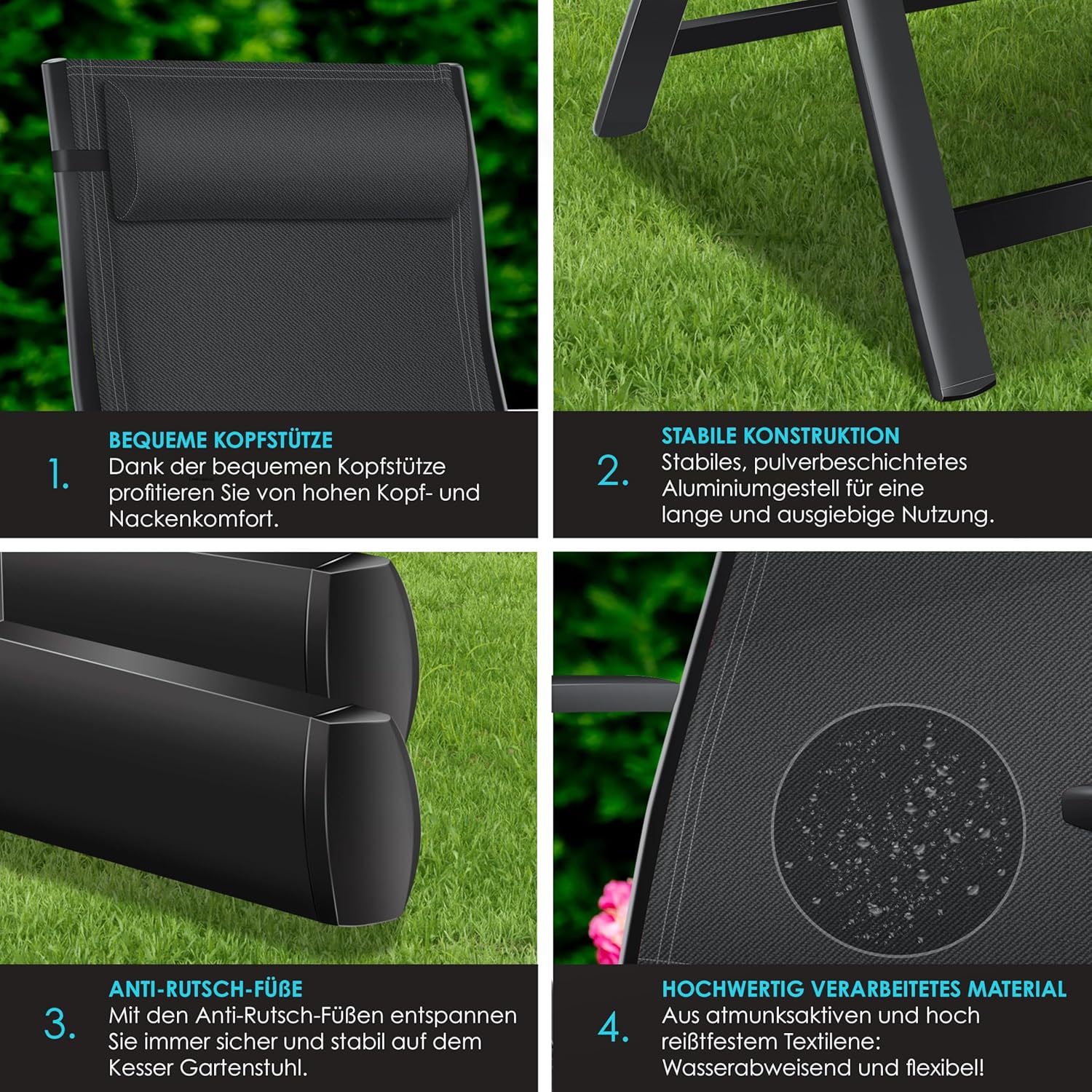 𝐂𝐎𝐍𝐅𝐎𝐑𝐓𝐀𝐁𝐋𝐄: vous pouvez vous détendre en toute sécurité et de manière stable sur la chaise de jardin Kesser à tout moment sans vous soucier des glissements indésirables. La finition de qualité supérieure et le design bien pensé font de cette chaise un compagnon fiable pour toute activité de plein air.