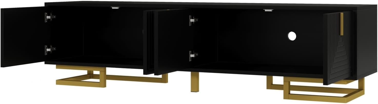 Ce meuble TV moderne est doté de quatre portes qui offrent un vaste espace de rangement pour accueillir facilement les télécommandes, les consoles de jeu et les équipements audiovisuels. Les trous pour les câbles à l’arrière sont conçus pour permettre aux fils de passer de manière ordonnée, ce qui permet de garder le plan de travail bien rangé. Les panneaux de porte sont complétés par des poignées verticales dorées et des pieds de support de forme unique, démontrant un style élégant et luxueux qui est à la fois un meuble et un élément décoratif dans le salon. Les charnières amortissant les vibrations garantissent une ouverture et une fermeture silencieuses et en douceur pour améliorer l’expérience de l’utilisateur, tandis que la structure en matériau solide est stable et durable, alliant beauté et praticité, apportant une élégance durable et des solutions de rangement efficaces à votre salon.