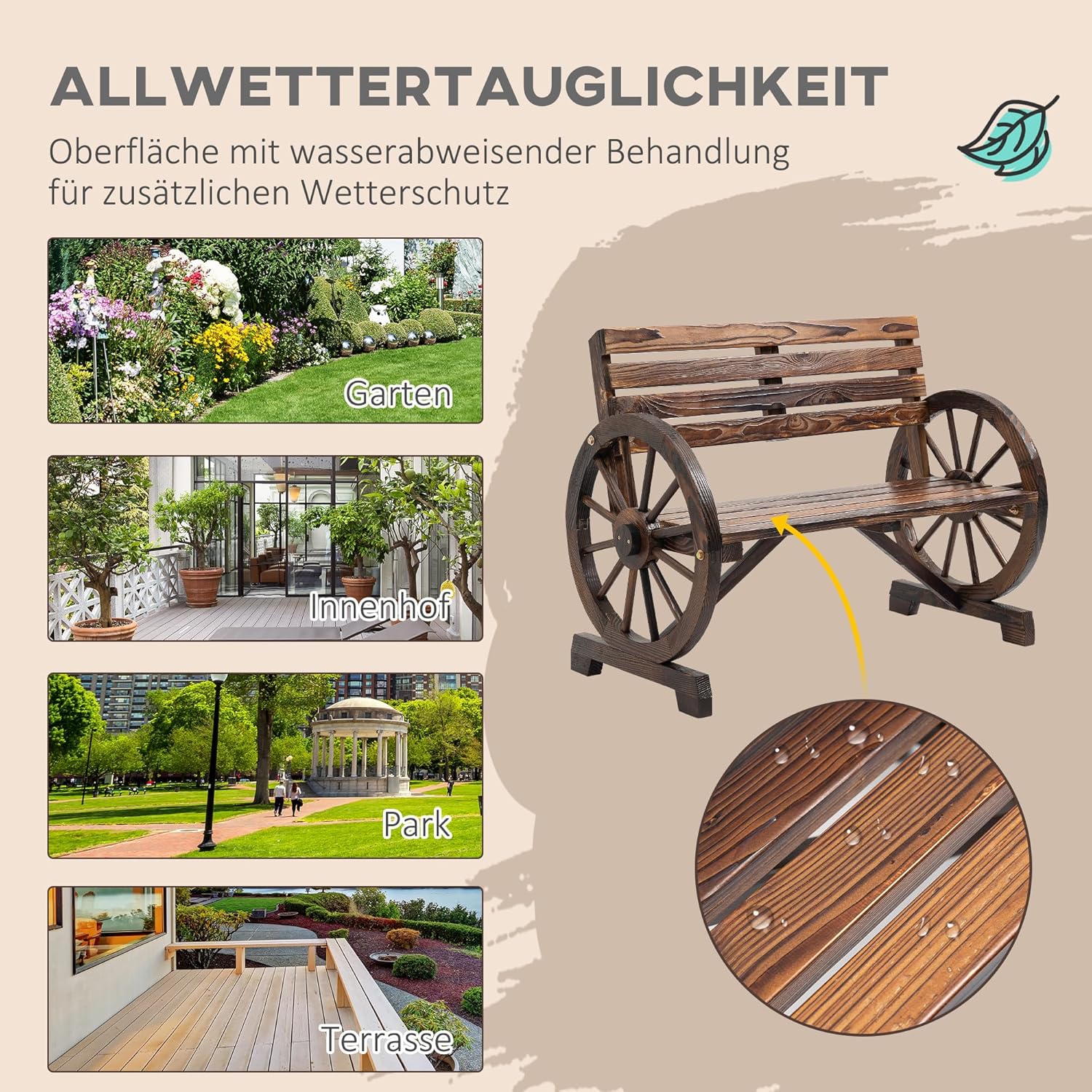 Banc de jardin de style maison de campagne, idéal pour terrasse, jardin et autres espaces extérieurs Point fort du design : Les roues de chariot forment des pieds et des accoudoirs Bois de sapin massif pour un look authentique et durable Beaucoup d’espace pour se reposer grâce au grand dossier et à l’assise Charge maximale : 240 kg