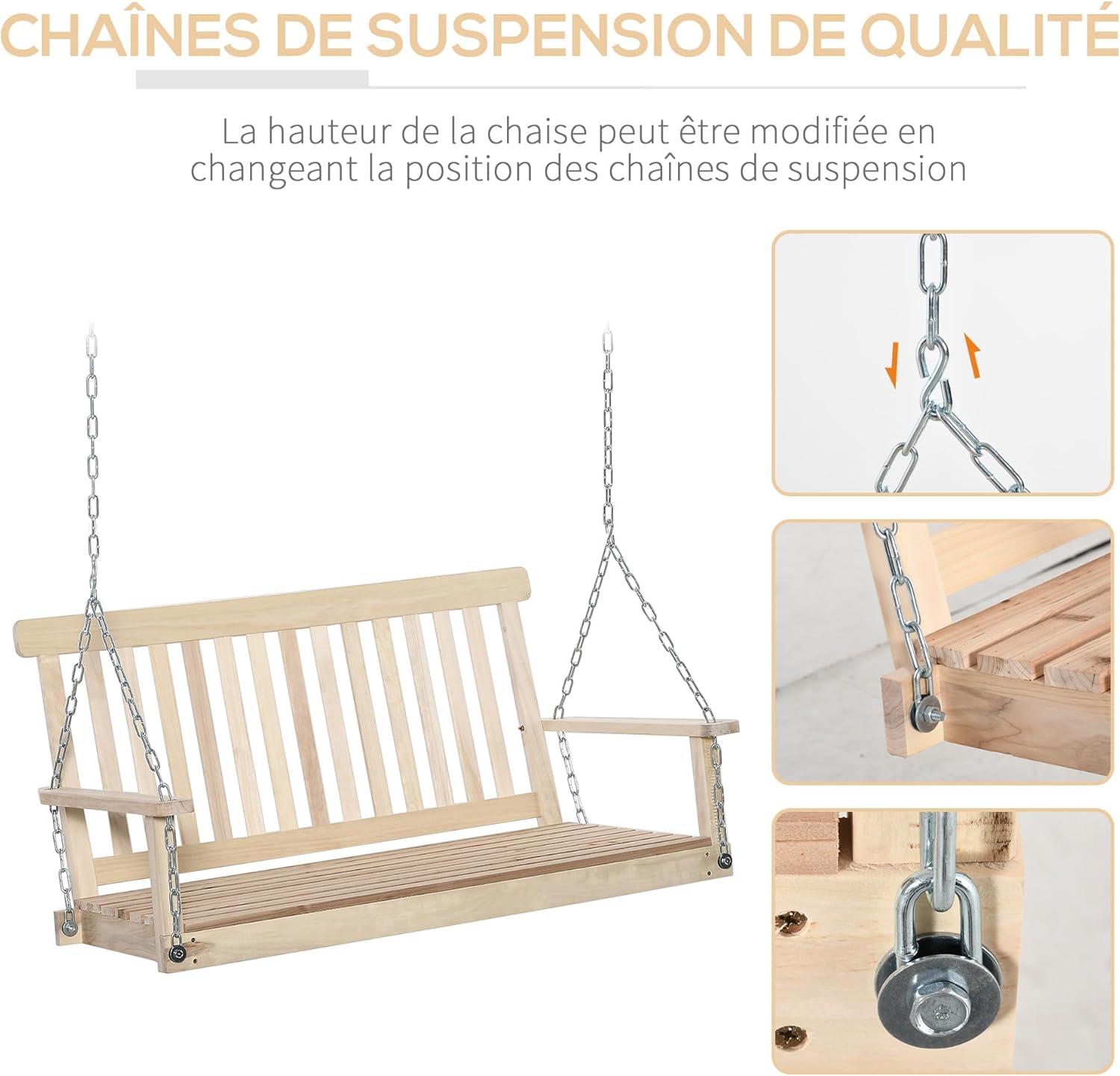 CHAÎNES DE SUSPENSION SÉCURISÉES : Équipé de chaînes en acier galvanisé de chaque côté, cette balançoire de jardin permet une installation sûre et fiable, idéale pour une assise élevée et sécurisée.