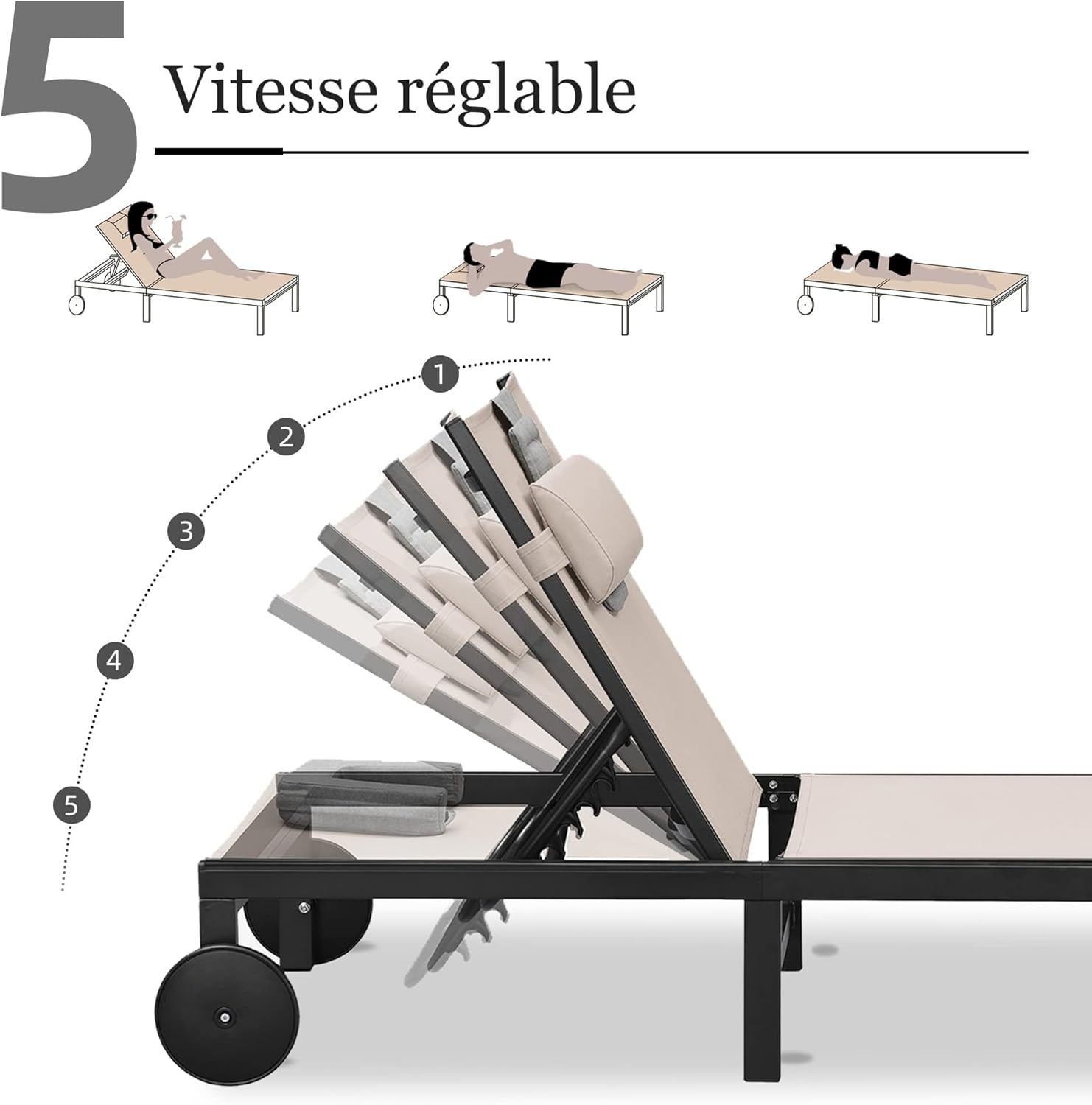 Les fonctions de dossier à 5 positions peuvent parfaitement répondre à vos différentes demandes d’assise. La chaise longue peut être réglée de presque verticale à plate.