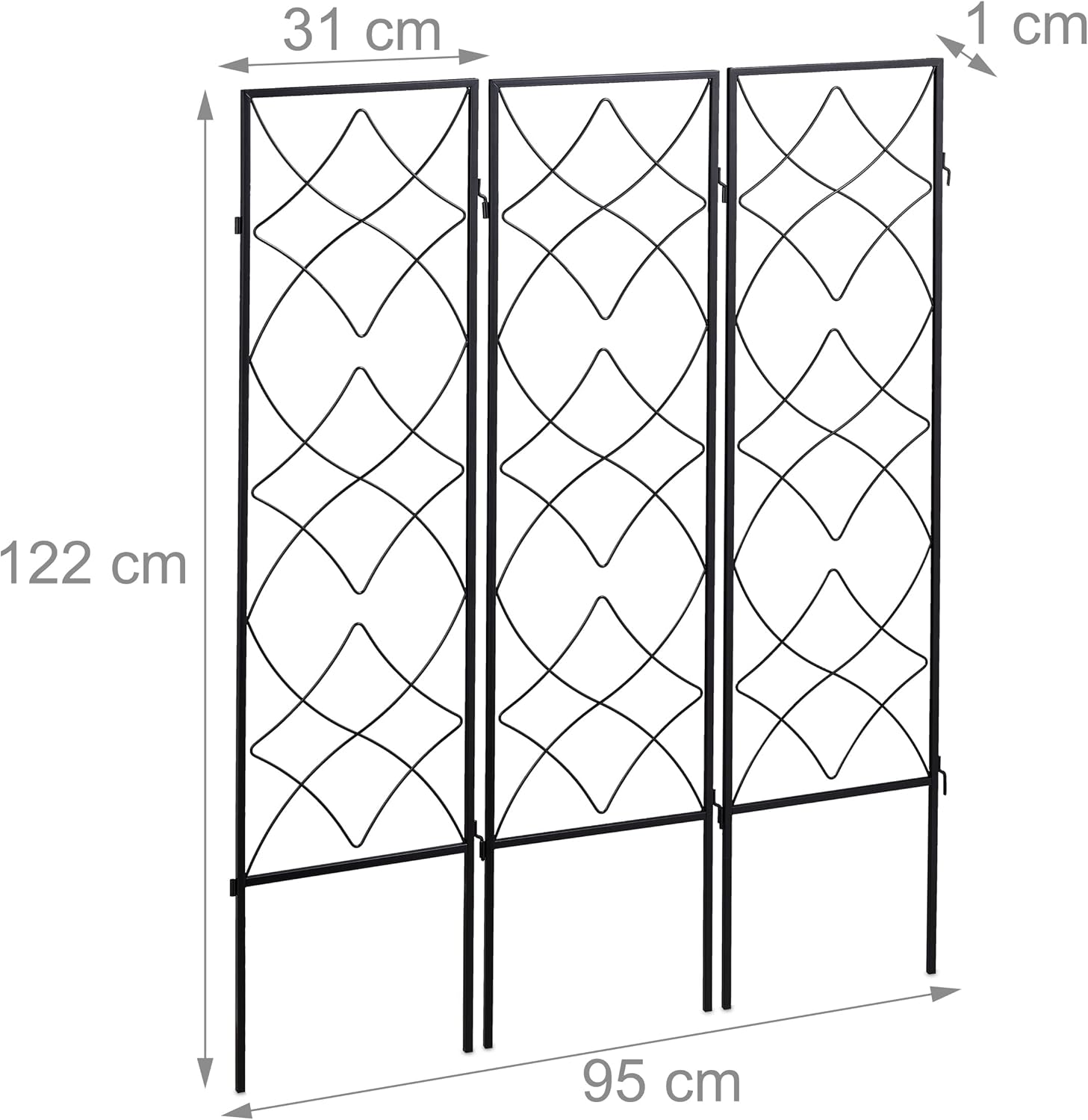 Ce treillis de jardin en lot de 3 soutient non seulement la croissance des plantes grimpantes, mais contribue aussi avec ses belles lignes et formes à un aménagement décoratif de jardin. Les plantes grimpantes comme le lierre, les roses, la clématite ou la vigne seront mis en avant grâce à cette arche rosier en métal. Décidez vous-même si vous voulez mettre en place les éléments individuellement ou ensemble. Les treillis sont simplement plantés dans le sol et peuvent être reliés entre eux par les charnières.Treillis de jardin en détails- Dimensions par treillis H x L x P : env. 122 x 31 x 1 cm- Largueur charnières inclues : env. 33 cm- Largueur totale éléments reliés : env. 95 cm- Hauteur support : env. 96,5 cm- Espace avec le sol : env. 25,5 cm- Poids par treillis : env. 1,3 kg- Matériau : Acier zingué- Couleur : NoirTreillis décoratif noir en métal- Pour les plantes d’agrément ou les plantes utiles- Améliore la croissance de vos plantes et leur offre un support- Avec un motif orné, décoratif qui attire l’attention- À planter simplement dans votre massif ou comme brise-vue- Utiliser les éléments individuellement ou relier-les- Treillis à mettre en place l’un à côté de l’autre ou en triangle- Métal galvanisé est robuste et résistant aux intempériesContenu de la livraison- 3x treillis de jardin- Livrés sans objets de décoration