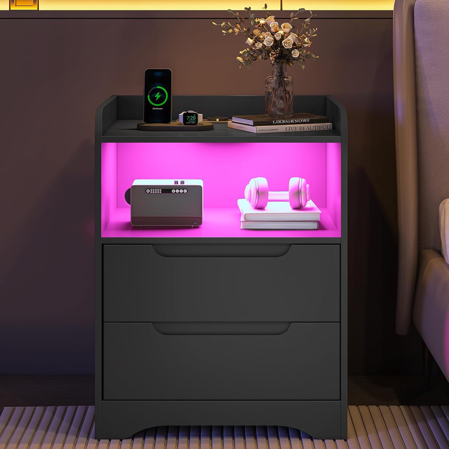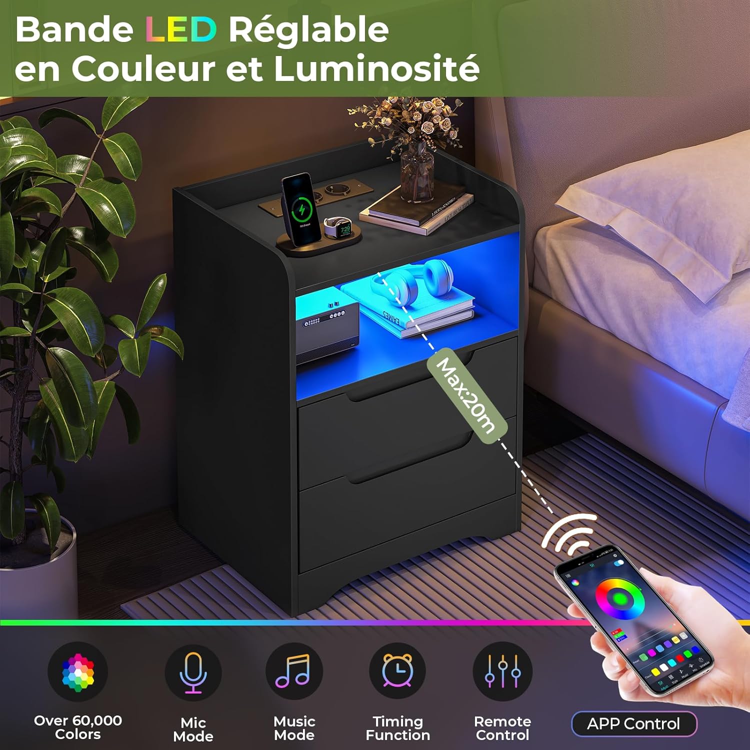 【Table de chevet avec Station de Charge】Équipée d’une multiprise avec 2 prises et 2 ports USB, cette table de chevet LED facilite le chargement de votre téléphone, lampe de bureau, réveil numérique et ordinateur portable. Lorsque vous jouez avec votre téléphone au lit, vous n’aurez pas à vous soucier de la batterie faible ou du manque de prises. Profitez de la meilleure expérience de charge avec cette table de nuit!