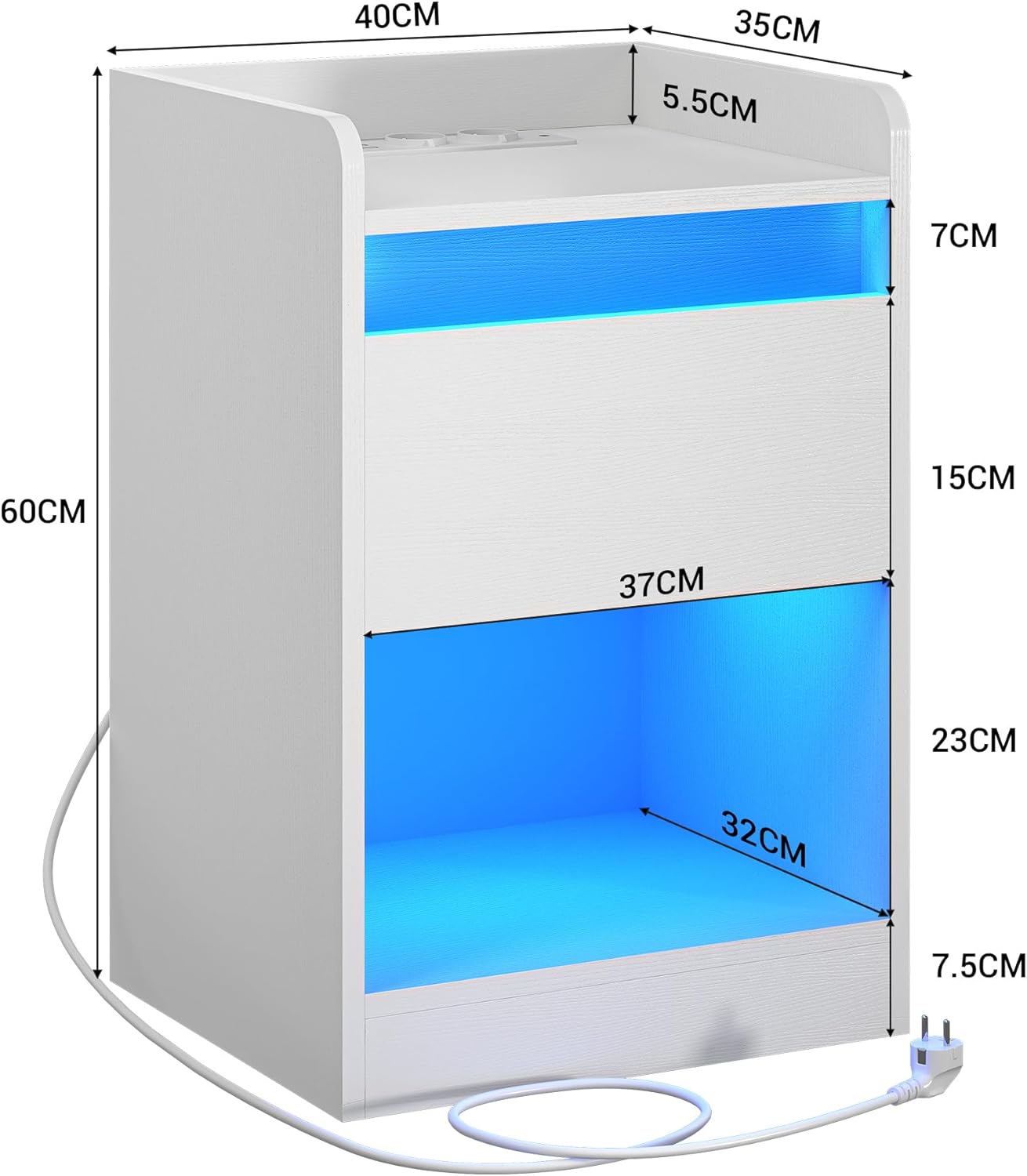 Multiprise avec Divers Ports : Cette table de chevet avec LED et multiprise est équipée de 2 prises, 1 port USB et 1 port USB C, vous permettant de charger votre téléphone et ordinateur sans vous soucier de la charge. Vous pouvez aussi l’utiliser comme table d’appoint dans votre salon ou dans divers autres scénarios grâce à sa polyvalence