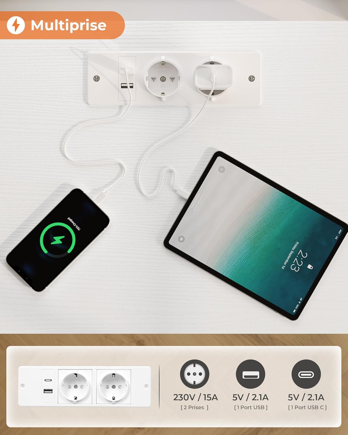 Équipée d’un port USB C de plus que les prises ordinaires pour répondre à vos besoins de charge pour différents produits électroniques