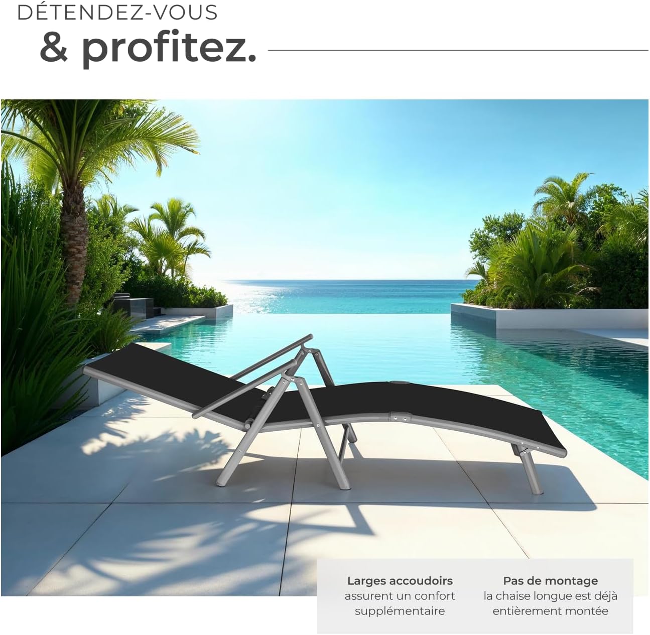 QUALITÉ ET RÉSISTANCE: Conçu pour durer, la chaise longue de jardin MARISOL est l’incarnation de la durabilité et de l’élégance. Son tressage en fibres textilène de qualité supérieure résiste aux intempéries et aux déchirures, faisant de ce transat jardin extérieur un choix idéal pour tout espace extérieur. Le cadre robuste en aluminium garantit une stabilité exceptionnelle, vous assurant des années de plaisir et de confort.