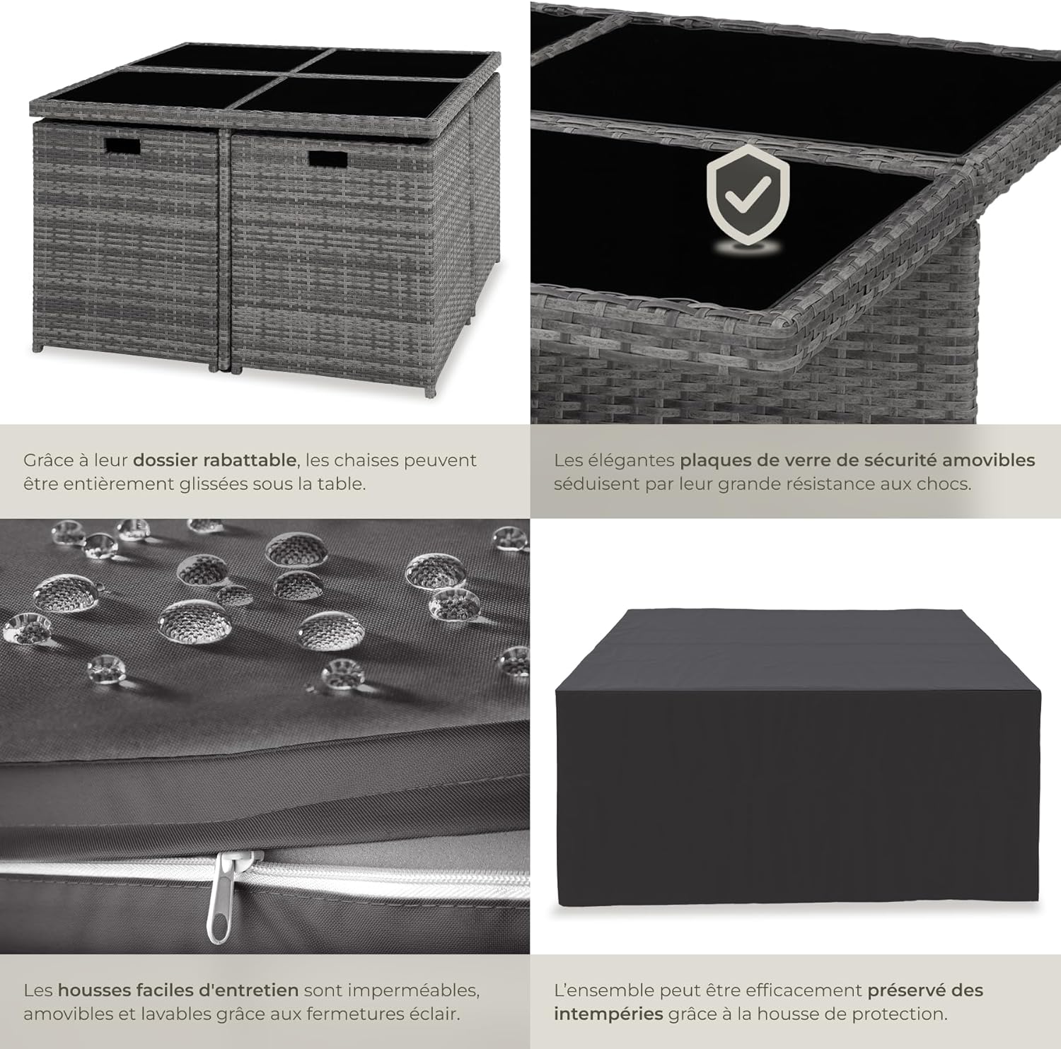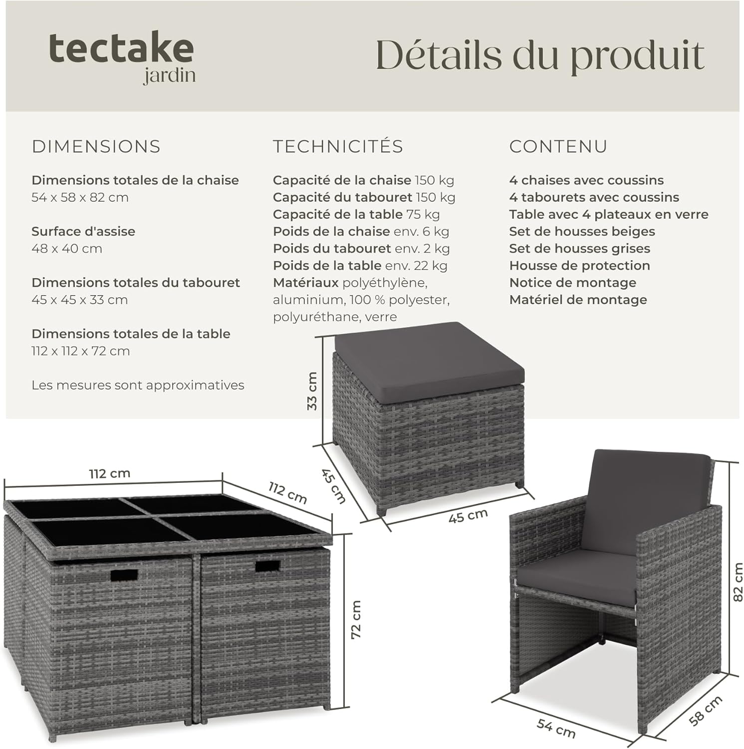 4 chaises avec coussins d’assise4 tabourets1 table avec 4 panneaux de verre2 sets de housses pour les assises (1 beige, 1 gris)1 housse de protection recouvrant l’ensemble du salon de jardin1 notice de montage illustrée et set de montage