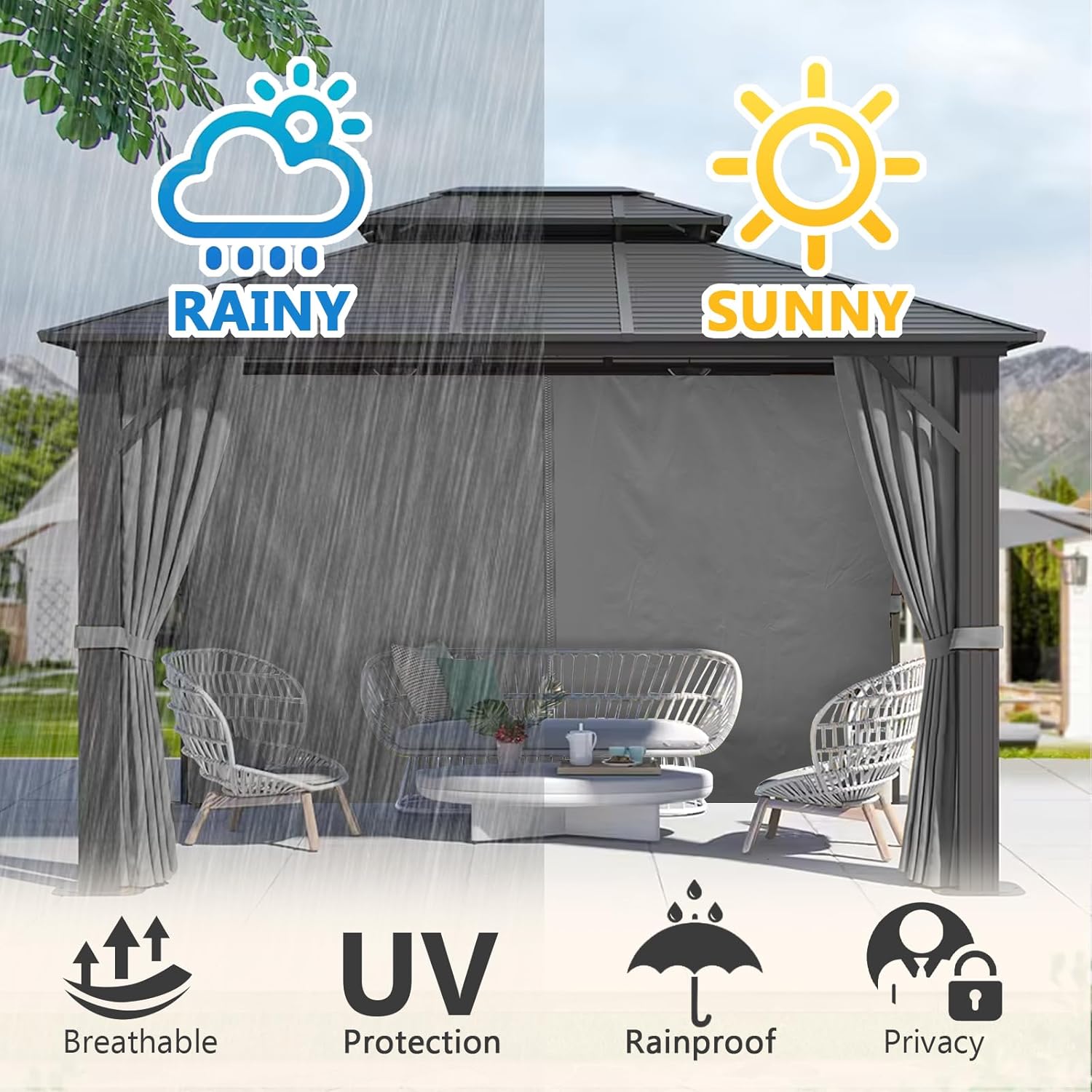 Transformez votre espace extérieur avec nos rideaux de tonnelle à 4 panneaux latéraux soigneusement fabriqués en tissu durable pour une protection ultime. Protégez-vous du soleil brûlant et de la pluie. Profitez de moments intimes avec vos proches dans une intimité absolue et créez des souvenirs inoubliables en plein air.