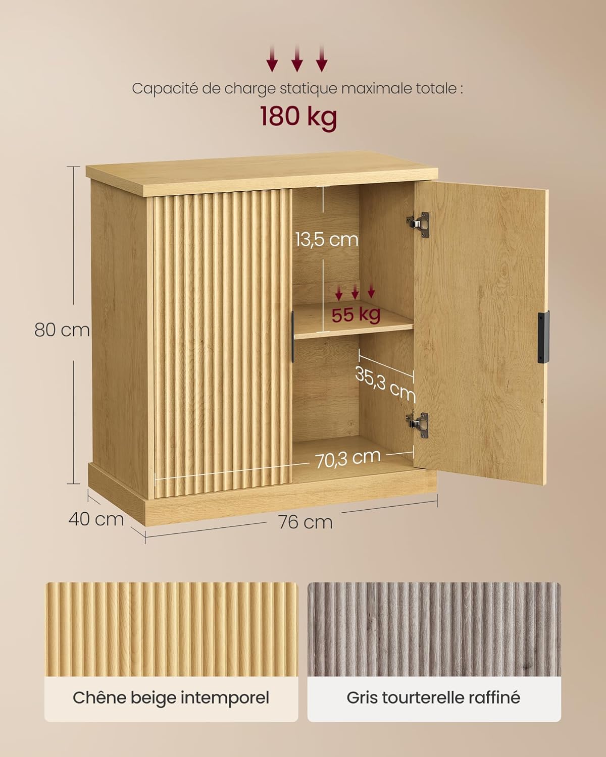 Couleur : Beige chêneMatériaux : Panneau d’aggloméré, panneau MDFDimensions : 40 x 76 x 80 cm (P x L x H)Poids : 24 kgCapacité de charge statique maximale : 180 kgCapacité de charge statique maximale de la partie supérieure : 70 kgCapacité de charge statique maximale de chaque étagère : 55 kg