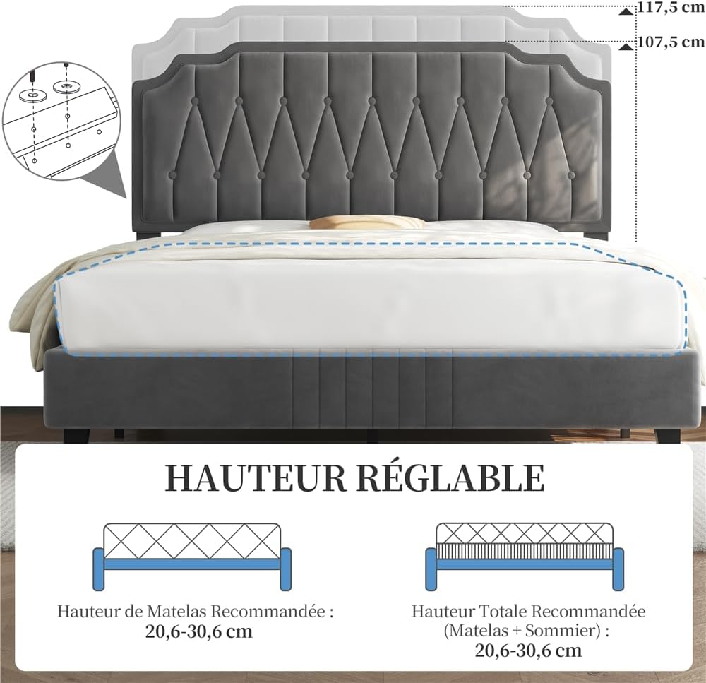 Couleur : Gris foncé – Matériau : contreplaqué, bois de peuplier, panneaux de bois MDF, métal, mousse, tissu velours en polyester. Dimensions : 203,5 cm x 146,5 cm x 107,5 cm – 117,5 cm – Surface de couchage : 140 cm x 200 cm (l x H) entre la tête de lit et la surface de couchage : 20,5 cm – 30,5 cm Nombre de lattes : 10 Distance entre les lattes : 12,5 cm – 13 cm. Garde au sol : 15,5 cm. Charge maximale : 360 kg