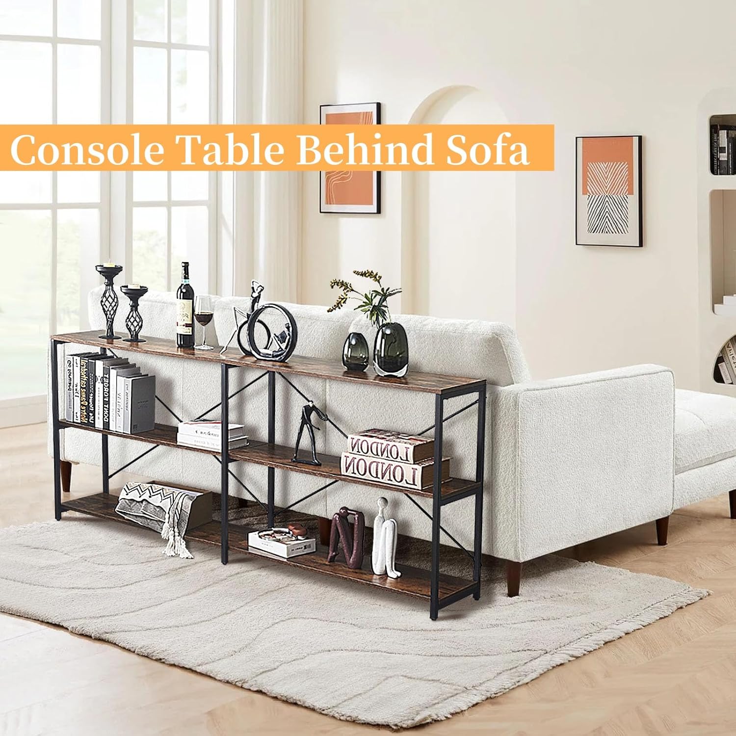【Espace de Rangement Ouvert】 : Cette table de salon de 180 cm dispose de 3 niveaux de séparation pour ranger vos objets du quotidien et vos décorations. Dans l’entrée ou le salon, vous pouvez ranger livres, verres à vin, vases, décorations, etc. Vous pouvez également la décorer différemment selon vos envies.