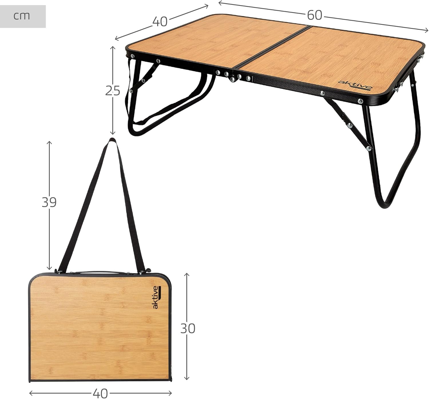 TABLE DE CAMPING PLIANTE, Cette table de camping pliable noir et bambou se compose d’un panneau en bois MDF et d’une structure en aluminium, Pliée, elle mesure 40×30 cm; et une fois déployée, 60x40x25 cm, Elle peut supporter jusqu’à 20 kg
