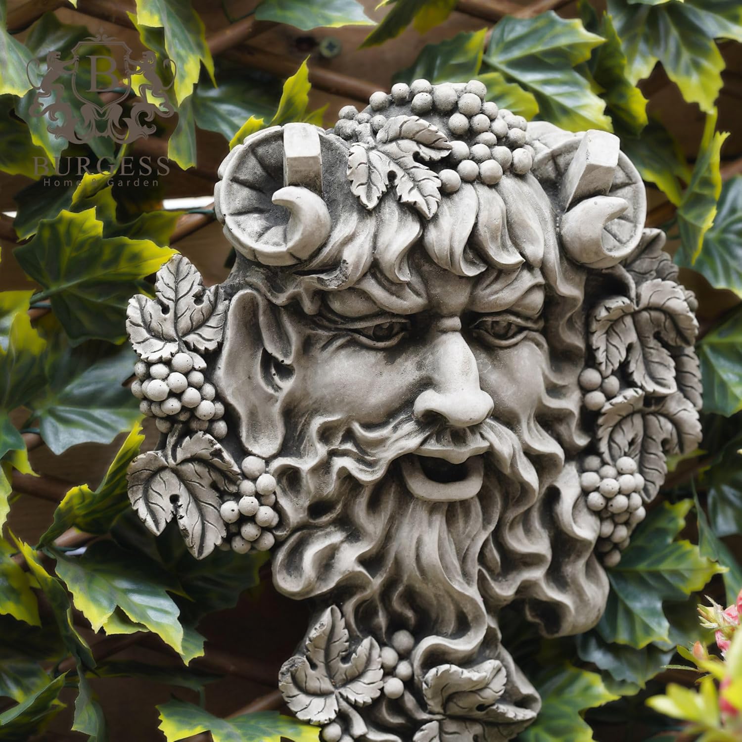 Bacchus, le dieu romain du vin et de la fertilité, est monté dans cette superbe plaque finie avec une patine antique Cette statue en pierre est élégamment conçue et résistante aux intempéries et au gel