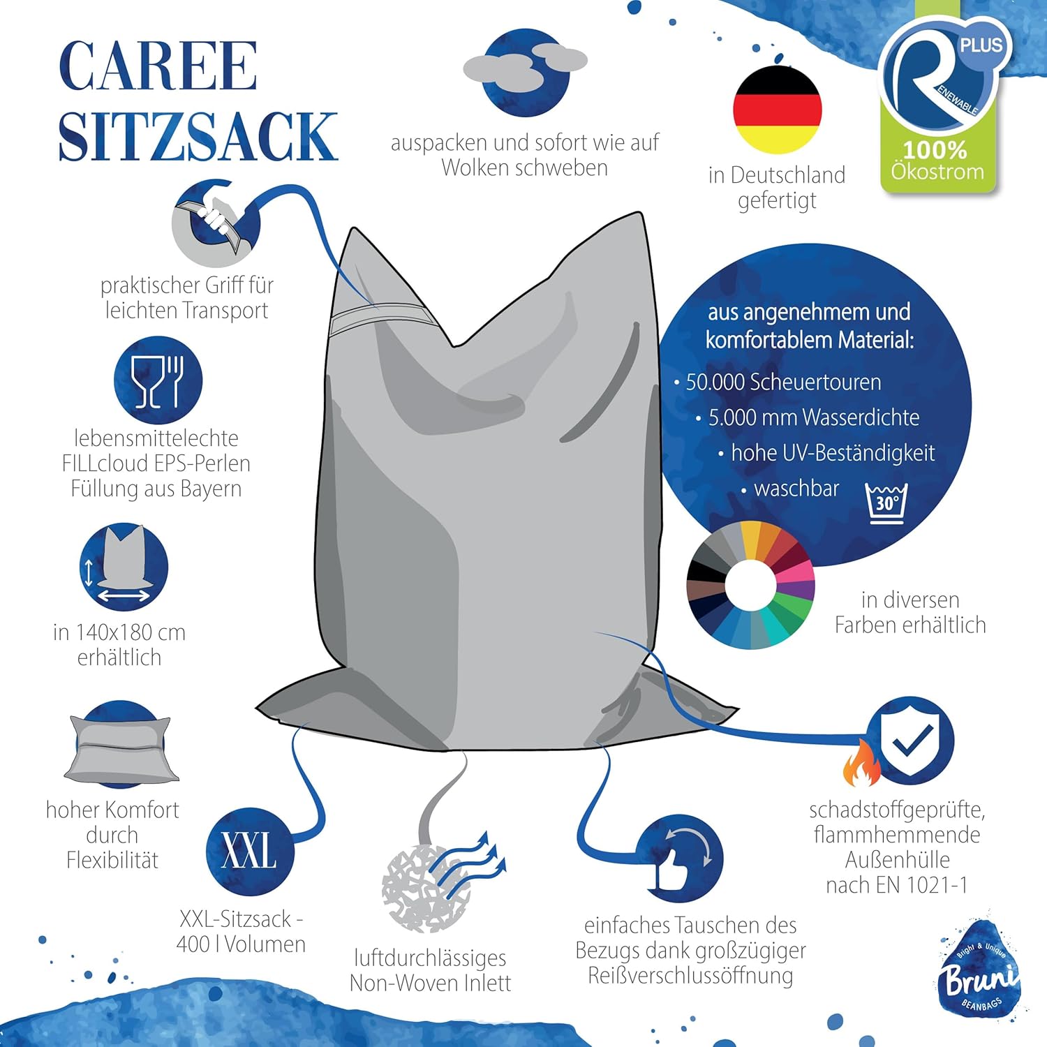 Pouf géant – 140 x 180 cm avec un volume de 400 l en provenance d’Allemagne : en raison du matériau extérieur agréable et certifié sans substances nocives et du rembourrage de pouf FILLcloud de qualité alimentaire, vous flottez dans le Bruni Caree comme sur des nuages. Fabriqué en Bavière et rempli sur place après votre commande, nous vous l’envoyons prêt à l’emploi – il suffit de déballer et de se détendre. En raison de sa forme, le pouf rectangulaire (avec poignée de transport pratique) offre différentes positions d’assise et de couchage pour un maximum de confort
