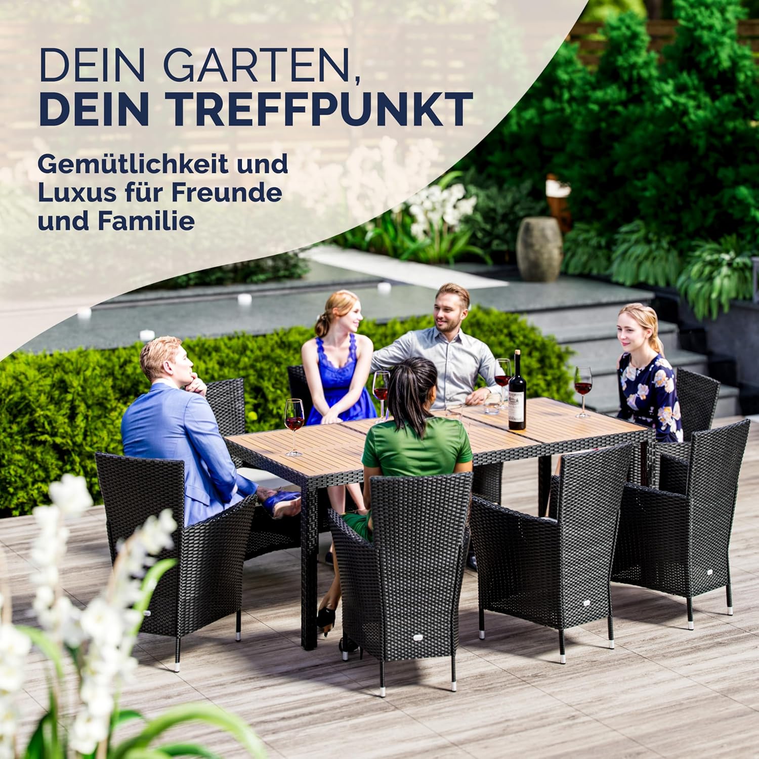 L’ensemble de meubles de terrasse de la marque CASARIA est composé d’une grande table de 190 x 90 x 75 cm et de 8 chaises de jardin. Le polyrotin tissé à la main est résistant aux intempéries et facile d’entretien. Idéal pour se détendre sur la terrasse ou le balcon.