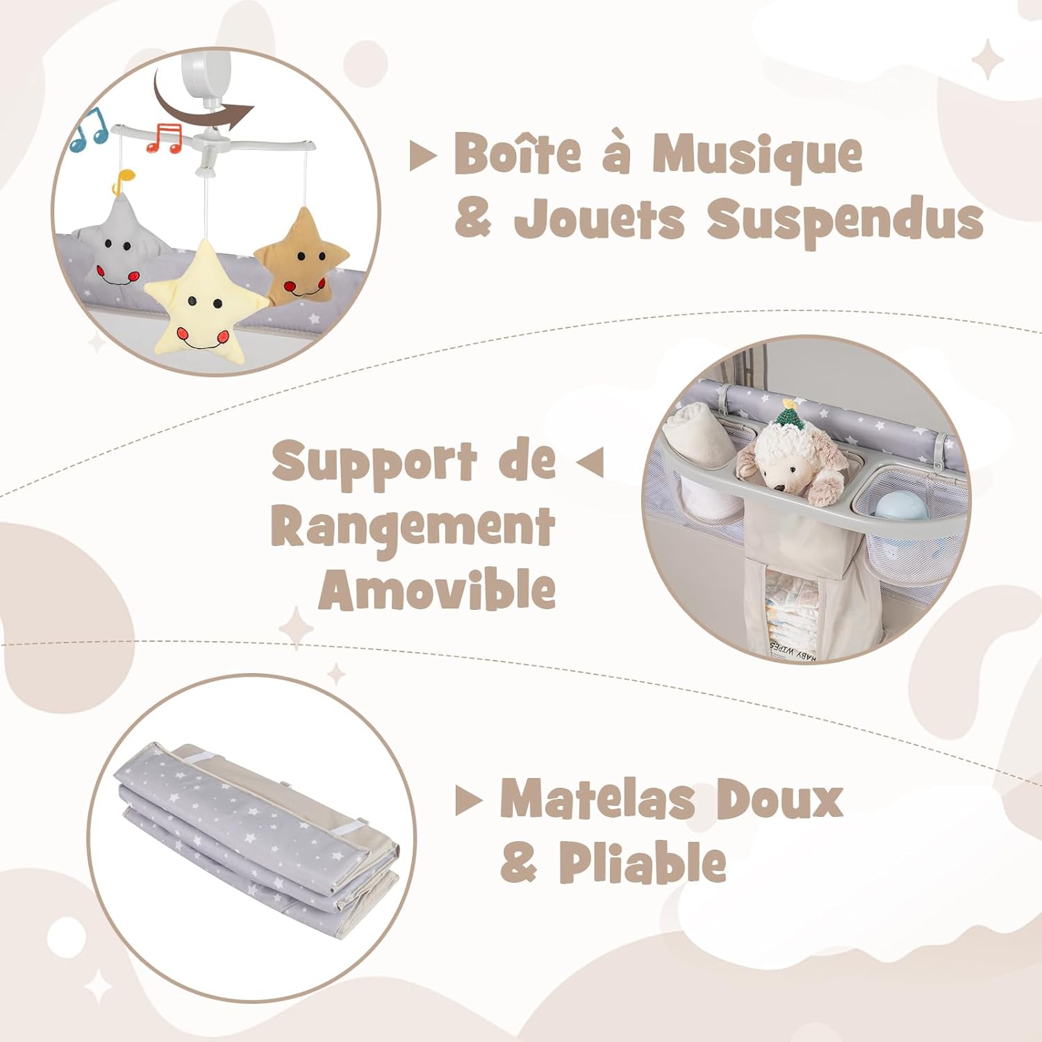 【Jouets suspendus & musique】3 différents jouets suspendus attirent l’attention du bébé, favorisant le développement de sa vue et améliorant sa capacité à saisir des objets. En tournant le bouton, la boîte à musique diffuse une mélodie claire.
