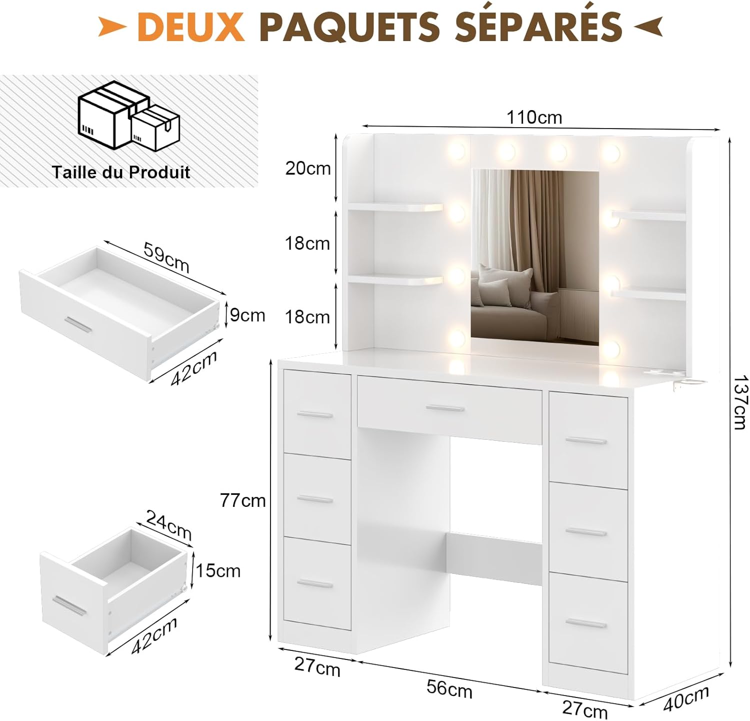 Espace de Rangement Polyvalent : La coiffeuse possède un vaste espace de rangement avec 6 compartiments ouverts au-dessus et 7 tiroirs spacieux en dessous. Les compartiments du haut sont idéaux pour ranger des produits cosmétiques, de soin de la peau et des parfums, accessibles facilement. Les tiroirs inférieurs permettent de stocker des objets plus encombrants comme des ustensiles de coiffure ou des produits cosmétiques de grande taille, pour une table toujours bien ordonnée
