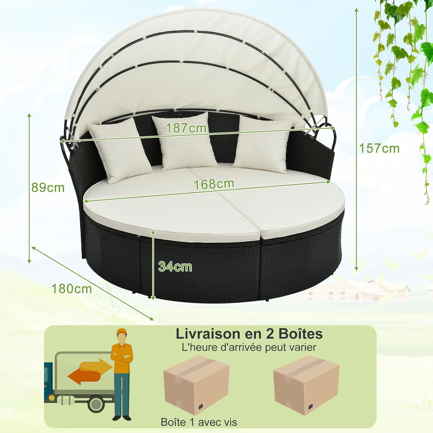 # 𝐒𝐚𝐥𝐨𝐧 𝐝𝐞 𝐉𝐚𝐫𝐝𝐢𝐧 𝐌𝐮𝐥𝐭𝐢𝐟𝐨𝐧𝐜𝐭𝐢𝐨𝐧𝐧𝐞𝐥 # Ce meuble extérieur peut être assemblé en lit circulaire ou séparé pour former un canapé et une banquette. Les coussins houssables sont amovibles, permettant ainsi d’utiliser la banquette comme table basse.