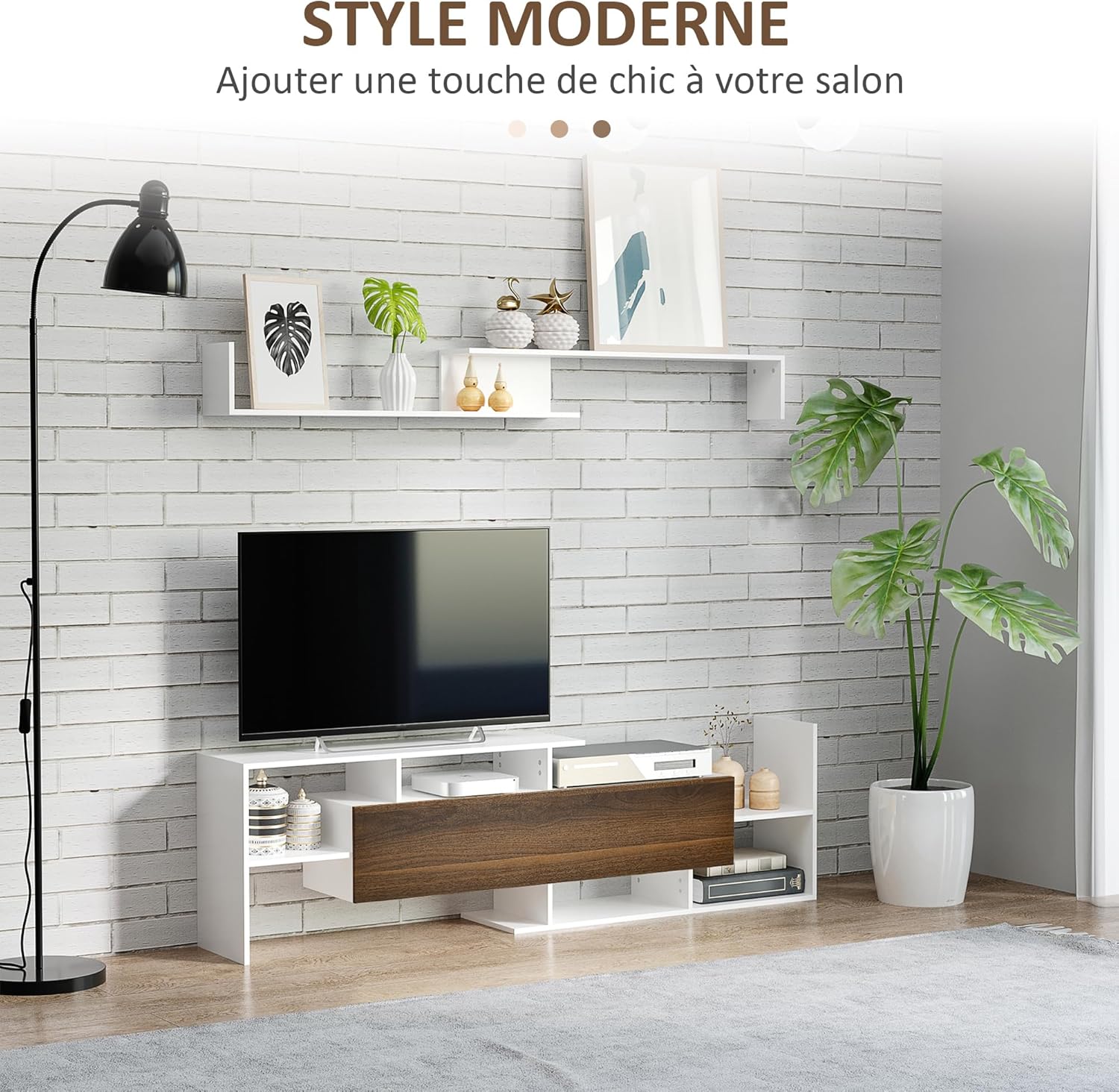 ÉTAGÈRE MURALE INCLUSE : En plus de la console TV, il y a une étagère murale, pour maximiser l’utilisation de l’espace mural tout en offrant un emplacement supplémentaire pour vos photos ou autres décorations.