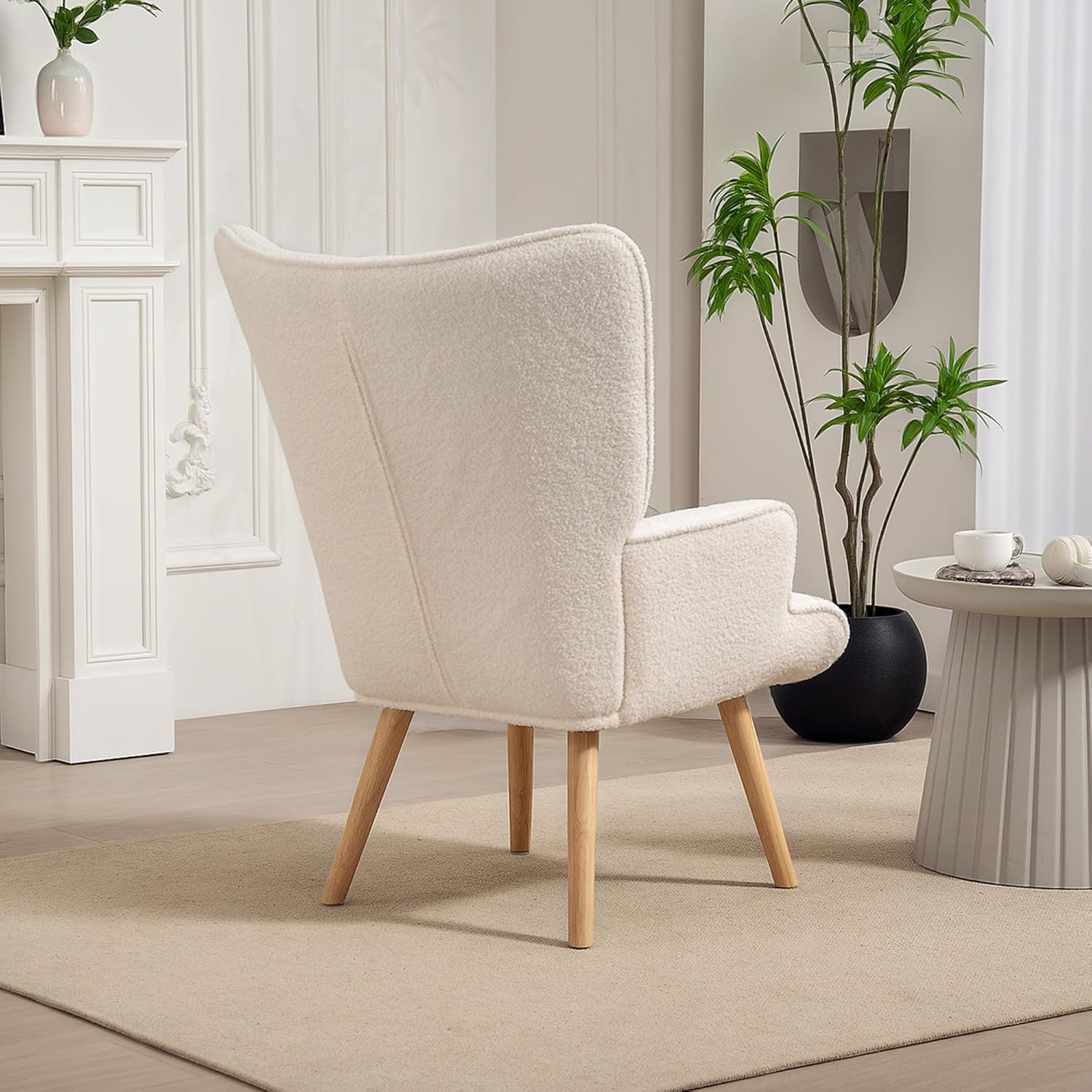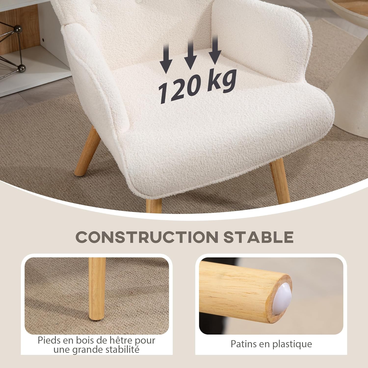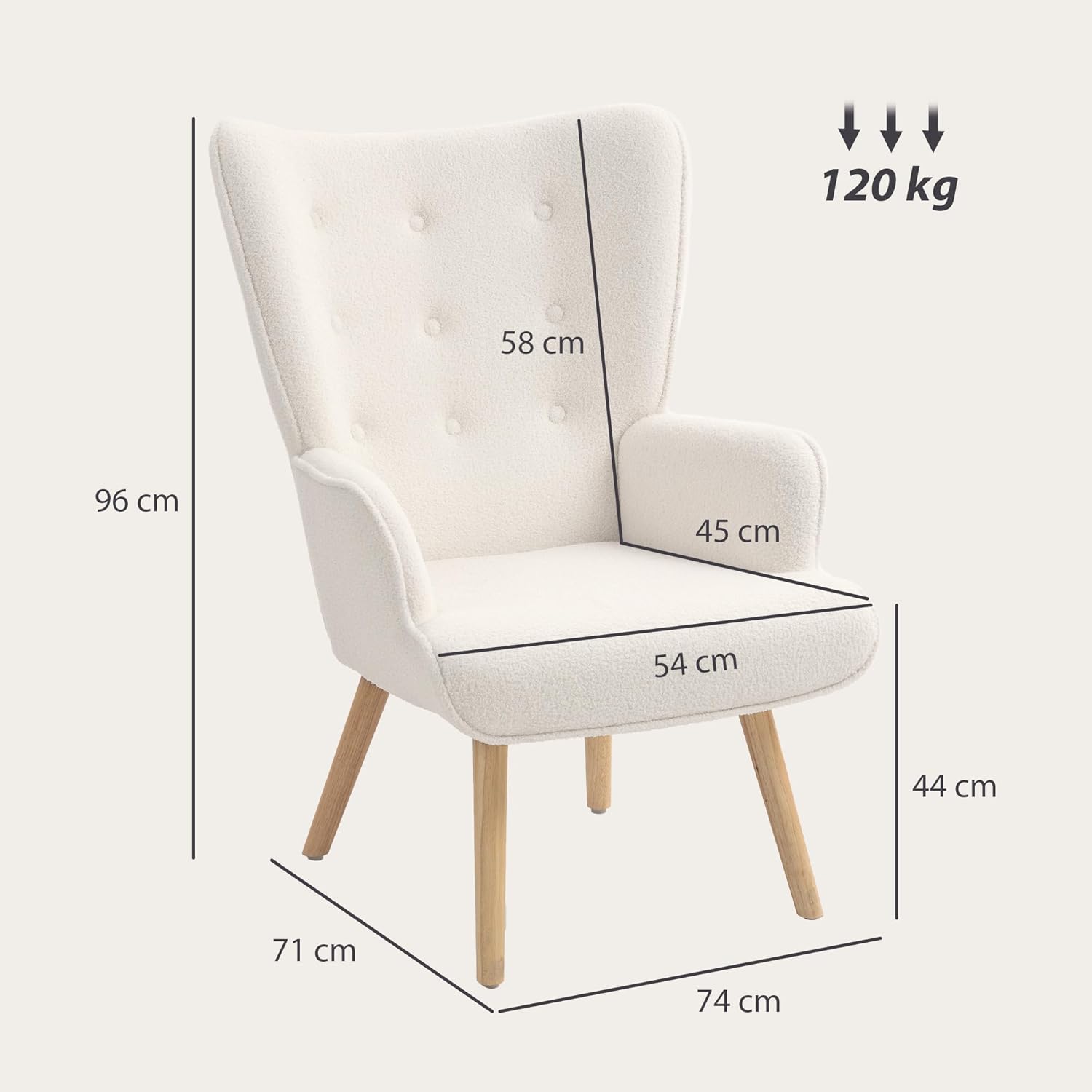 Léger dossier à oreilles et design capitonné qui rehausse l’attrait visuel Fauteuil de salon en rembourrage mousse haute densité pour une assise confortable Dossier incurvé avec accoudoirs pour soutenir votre corps Ce fauteuil pour chambre en tissu bouclette respirant convenant à toutes les saisons Pieds en bois de hêtre offrant un soutien fiable Patins en plastique qui protègent les sols et améliorent la stabilité Le fauteuil beige à l’utilisation polyvalente dans un bureau, un salon ou une chambre Montage nécessaire