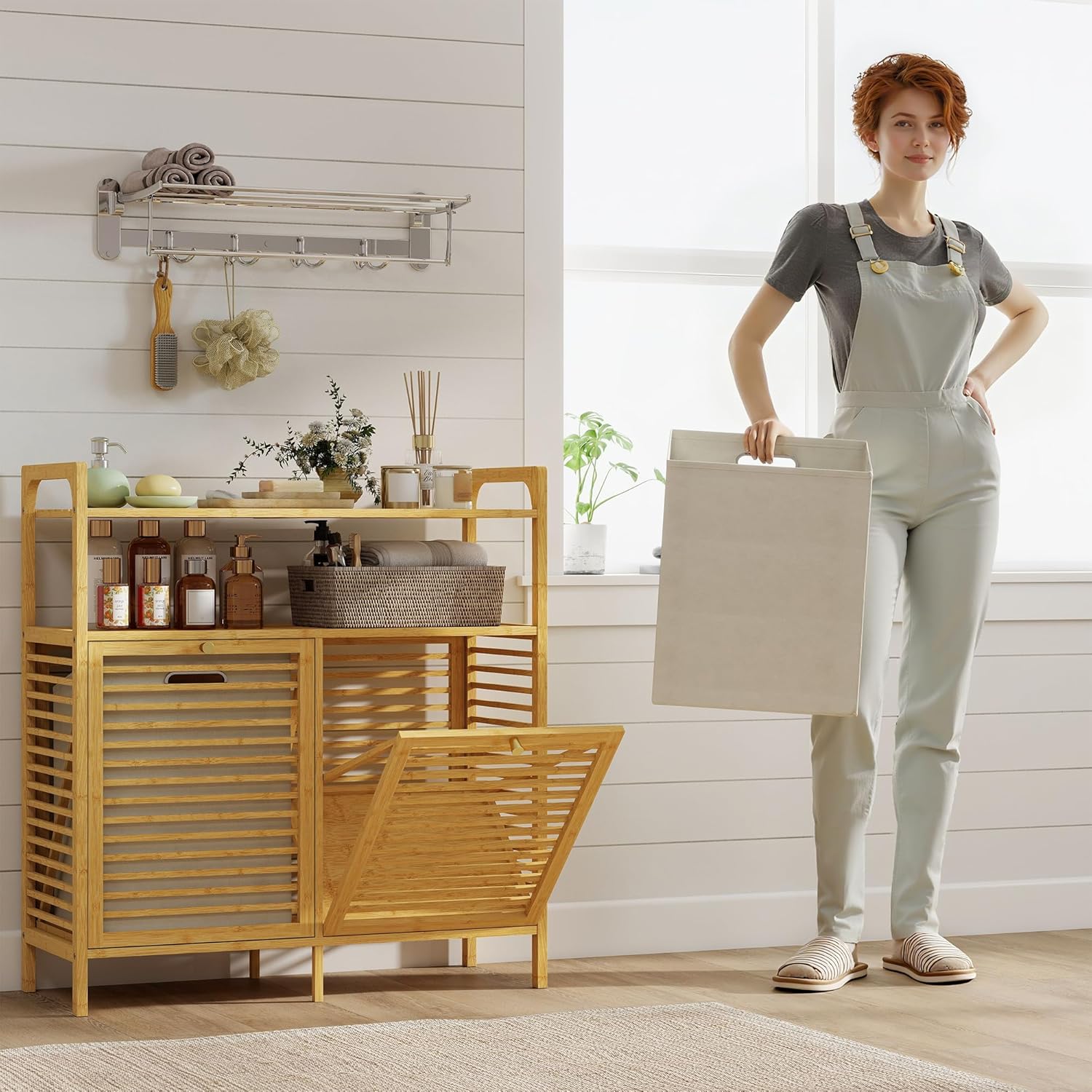 Deux paniers amovibles de 41 L classent les vêtements, prévenant la contamination croisée Deux étagères spacieuses organisent les fournitures, maximisant l’espace de rangement vertical Meuble de salle de bain en bambou naturel avec finition vernie assure la durabilité et ajoute une beauté naturelle Des sangles anti-basculement fournissent une sécurité renforcée pour les familles Le design à lattes et le panier en tissu permettent une circulation de l’air pour garder les vêtements frais Meuble à linge sale avec porte basculante pratique offre un accès facile à la lessive Ce meuble avec panier à linge avec une base surélevée de 7 cm évite les éclaboussures d’eau et garde les vêtements au sec Montage nécessaire