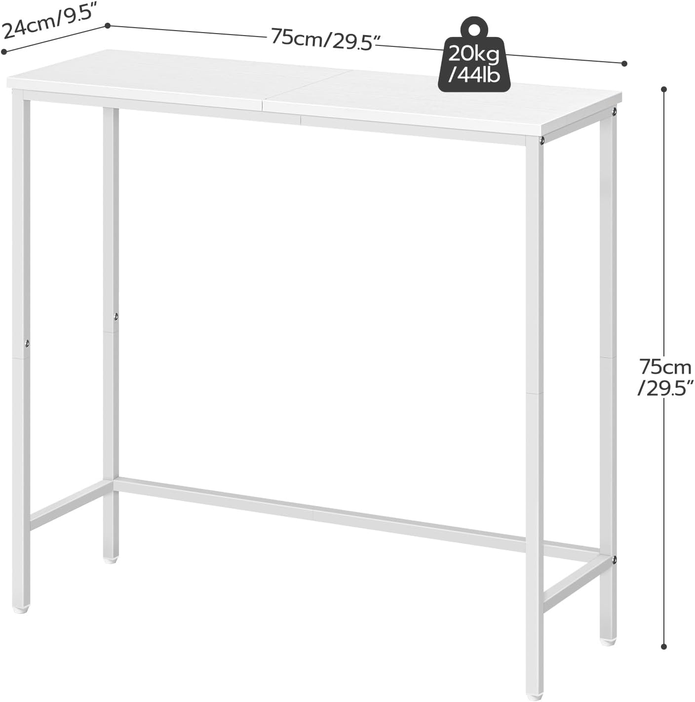 Couleur: Blanc Matériau: Panneau de particules, cadre en fer Dimensions: 75 x 24 x 75 cm (L x l x h) Livraison: 1 x Table de console; 1 x Sac d’accessoires; 1 x Mode d’emploi (FR, DE, EN, ES, IT) HOOBRO Précautions : Veuillez d’abord positionner et régler les pièces en faisant référence à la notice de montage, puis effectuer un serrage progressif. HOOBRO Précautions : Capacité de charge statique maximale : 20 kg