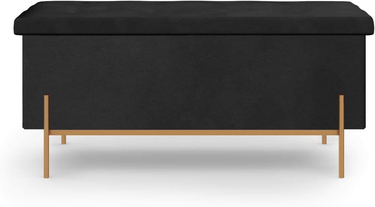Adoptez le banc coffre de rangement capitonné 100 cm en velours noir et pieds dorés !