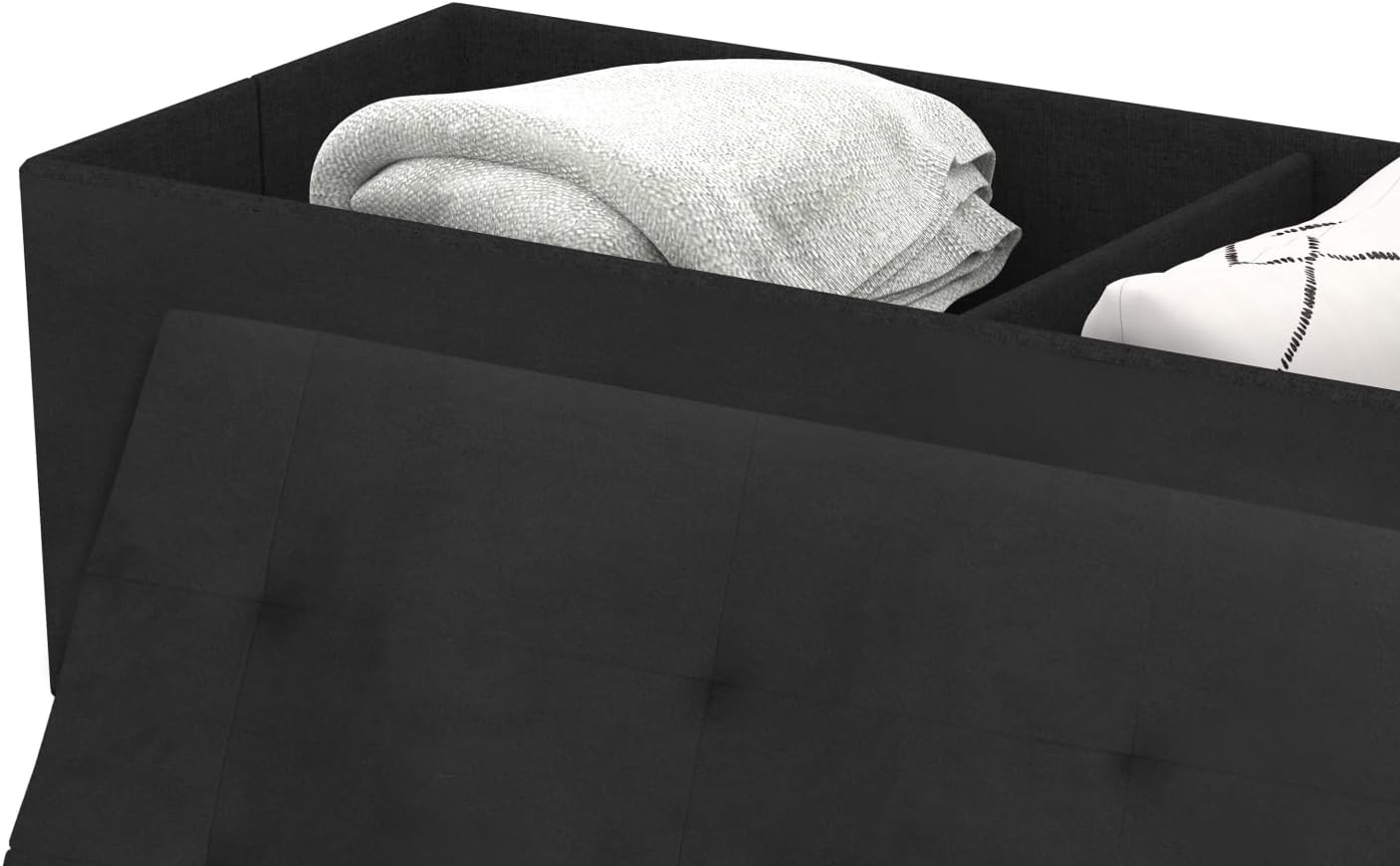 Vous pouvez dès à présent ranger discrètement tous vos vêtements, chaussures, plaids, jouets, livres ou tout autre objet grâce à notre banc coffre 100 cm en tissu velours noir.Pratique, avec sa maxi capacité de rangement, fini les affaires qui traînent ! Gardez vos objets discrètement rangés à l’abri de la poussière et à portée de main !Doté de belles finitions, son couvercle joliment capitonné en tissu velours noir moderne lui confère un design chic. En plus d’être agréable au toucher, sa surface rembourrée aux 8 capitons en fait une assise d’appoint confortable.Surélevé de pieds en métal doré et doté d’une structure en MDF, il est stable et robuste. De plus, avec son poids léger, il est facilement transportable.Esthétique et discret, installez-le où bon vous semble : dans votre chambre comme bout de lit, votre dressing, votre vestibule contre un mur comme meuble d’entrée, dans une salle de jeux, ou tout simplement dans votre salon.Vous n’avez plus qu’à y poser un plaid ou de petits coussins colorés pour parfaire la décoration et le confort de votre pièce ! Dimensions du banc de rangement LOUIS 100 cmDimensions globales : Longueur 100 cm x largeur 37 cm x Hauteur 45 cmDimension intérieure : L. 96 x l. 34 x H. 28,5 cm avec 1 séparateur en 3 positions possiblesHauteur pieds : 13 cmMatériaux : MDF, polyester et métalColoris : noir et pieds dorésÀ monter soi-mêmeRetrouvez l’ensemble de nos coffres de rangement sur notre boutique en ligne !