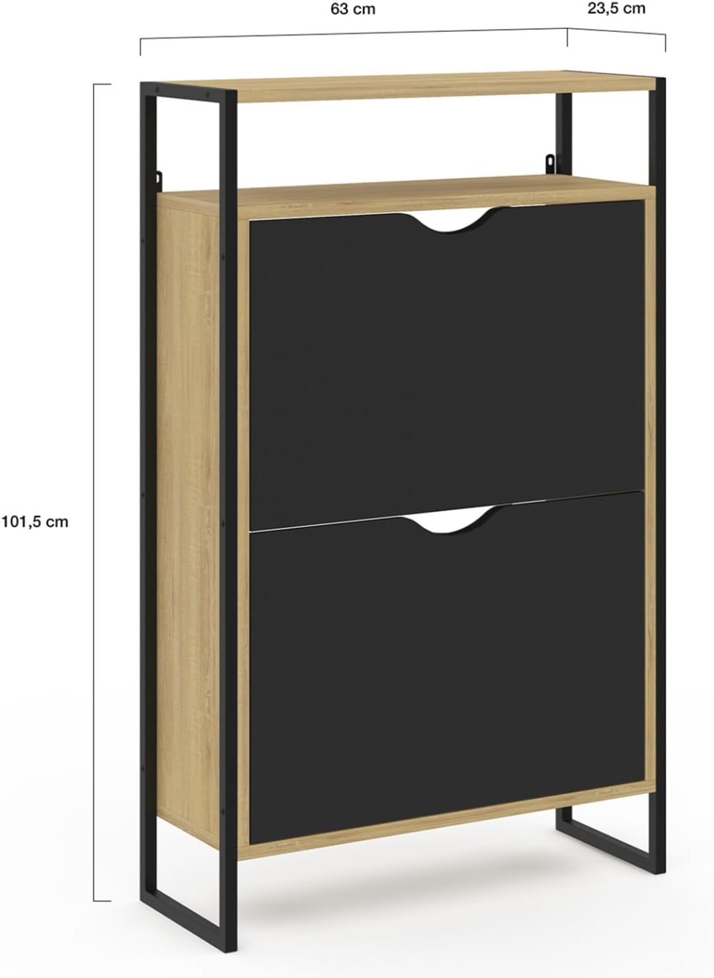 Avec sa capacité de 12 paires de chaussures, 6 paires par compartiment, toute la famille trouvera une place pour garder ses chaussures à l’abri de la poussière ! Les espaces de rangement sont séparés intérieurement par une cloison intermédiaire très pratique pour organiser votre dressing à chaussures. De plus, les abattants des portes, gain de place, permettent une ouverture aisée.Son étagère supérieure quant à elle est idéale pour placer votre vide-poche et poser de jolis objets décoratifs ou petites plantes vertes.Astucieux grâce à ses dimensions compactes, il n’encombrera pas votre pièce !De son côté, la structure en particules de bois et en métal apporte design, mais aussi robustesse et stabilité au meuble.Vous pouvez également l’installer dans une buanderie, un dressing, ou même un bureau ! Combinez les par 1, par 2 ou par 3 selon vos besoins !Ne laissez plus traîner vos paires de chaussures et craquez pour ce meuble d’entrée industriel qui fera de votre vestibule un espace accueillant et bien rangé ! Dimensions du meuble chaussures BOSTON design industrielDimensions globales : Longueur 63 cm x largeur 23,5 cm x Hauteur 101,5 cmHauteur de l’étagère : 15 cmHauteur des portes : 35 cmMatériaux : Particules de bois et métalColoris : Bois et noirÀ fixer au mur pour éviter tout risque de basculementMeuble à chaussures prévu pour des pointures allant jusqu’au 41À monter soi-mêmeCe modèle existe également dans la collection LUIS en coloris bois clair et métal noir.Retrouvez l’ensemble de notre collection industrielle sur notre boutique en ligne !