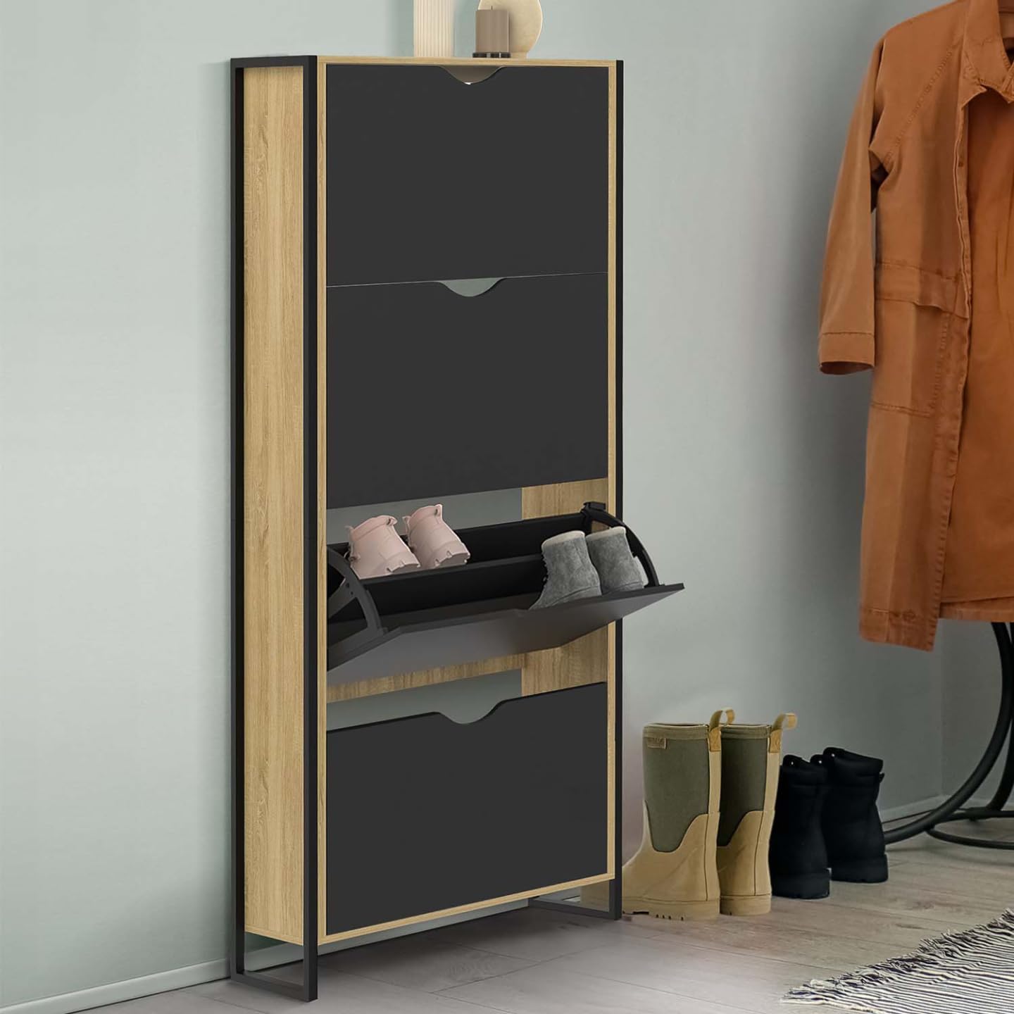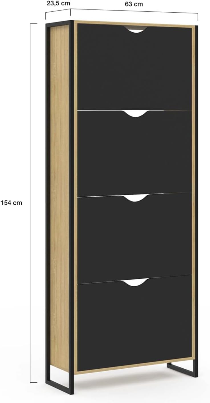 Avec sa capacité de 24 paires de chaussures, 6 paires par compartiment, toute la famille trouvera une place pour garder ses chaussures à l’abri de la poussière ! Les espaces de rangement sont séparés intérieurement par une cloison intermédiaire très pratique pour organiser votre dressing à chaussures. De plus, les abattants des portes, gain de place, permettent une ouverture aisée.Son plateau supérieur quant à lui est idéal pour placer votre vide-poche et poser de jolis objets décoratifs ou petites plantes vertes.Astucieux grâce à ses dimensions compactes, il n’encombrera pas votre pièce !De son côté, la structure en particules de bois et en métal apporte design, mais aussi robustesse et stabilité au meuble.Vous pouvez également l’installer dans une buanderie, un dressing, ou même un bureau ! Combinez les par 1, par 2 ou par 3 selon vos besoins !Ne laissez plus traîner vos paires de chaussures et craquez pour ce meuble d’entrée industriel qui fera de votre vestibule un espace accueillant et bien rangé ! Dimensions du meuble chaussures BOSTON design industrielDimensions globales : Longueur 63 cm x largeur 23,5 cm x Hauteur 154 cmHauteur des portes : 35 cmMatériaux : panneaux de particules et tubes en métalColoris : Bois et boisÀ fixer au mur pour éviter tout risque de basculementMeuble à chaussures prévu pour des pointures allant jusqu’au 41À monter soi-même (meuble en deux parties)Ce modèle existe également dans la collection LUIS en coloris bois clair et métal noir.Retrouvez l’ensemble de notre collection industrielle sur notre boutique en ligne !