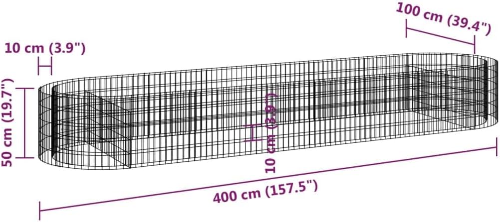 【Couleur & Dimensions】Couleur : argenté. Matériau : fer galvanisé. Dimensions : 400 x 100 x 50 cm (L x l x H). Taille du filet : 10 x 5 cm (L x l). Épaisseur : 3,5 mm. L’assemblage est requis. Veuillez noter que les pierres et les plantes ne sont pas incluses dans la livraison.