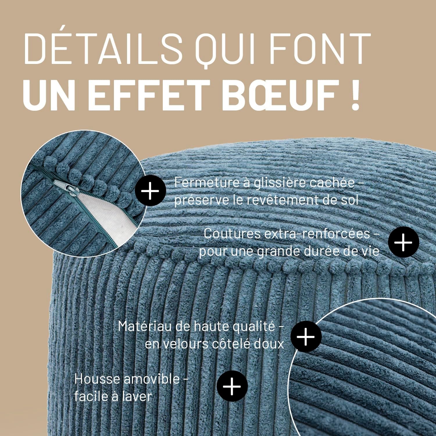 Fermeture éclair dissimulée : le pouf en velours côtelé offre un autre détail avec un effet impressionnant. En effet, même après de nombreuses heures de détente dans de grands tours – ou en solo douillet – les revêtements de sol restent épargnés par les rayures et les mauvaises éraflures. La fermeture éclair dissimulée rend cela possible. Ainsi, vous pouvez placer le pouf dans n’importe laquelle de vos pièces préférées sans vous soucier des sols.