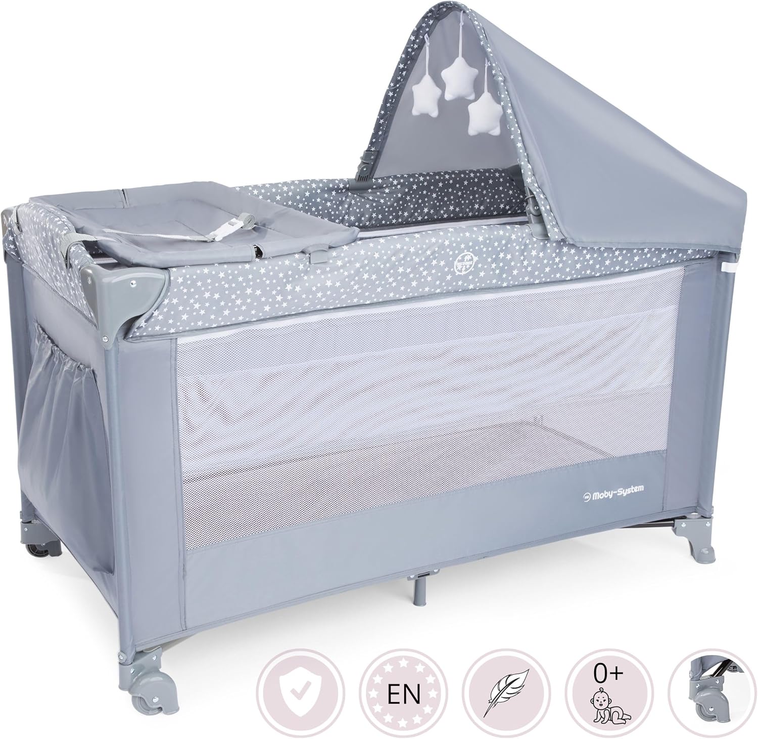 Le lit bébé peut également devenir un endroit sûr pour jouer. Ses parois latérales en maille sont de la plus haute qualité et garantissent une bonne circulation de l’air. L’enfant peut observer son environnement tout en jouant.