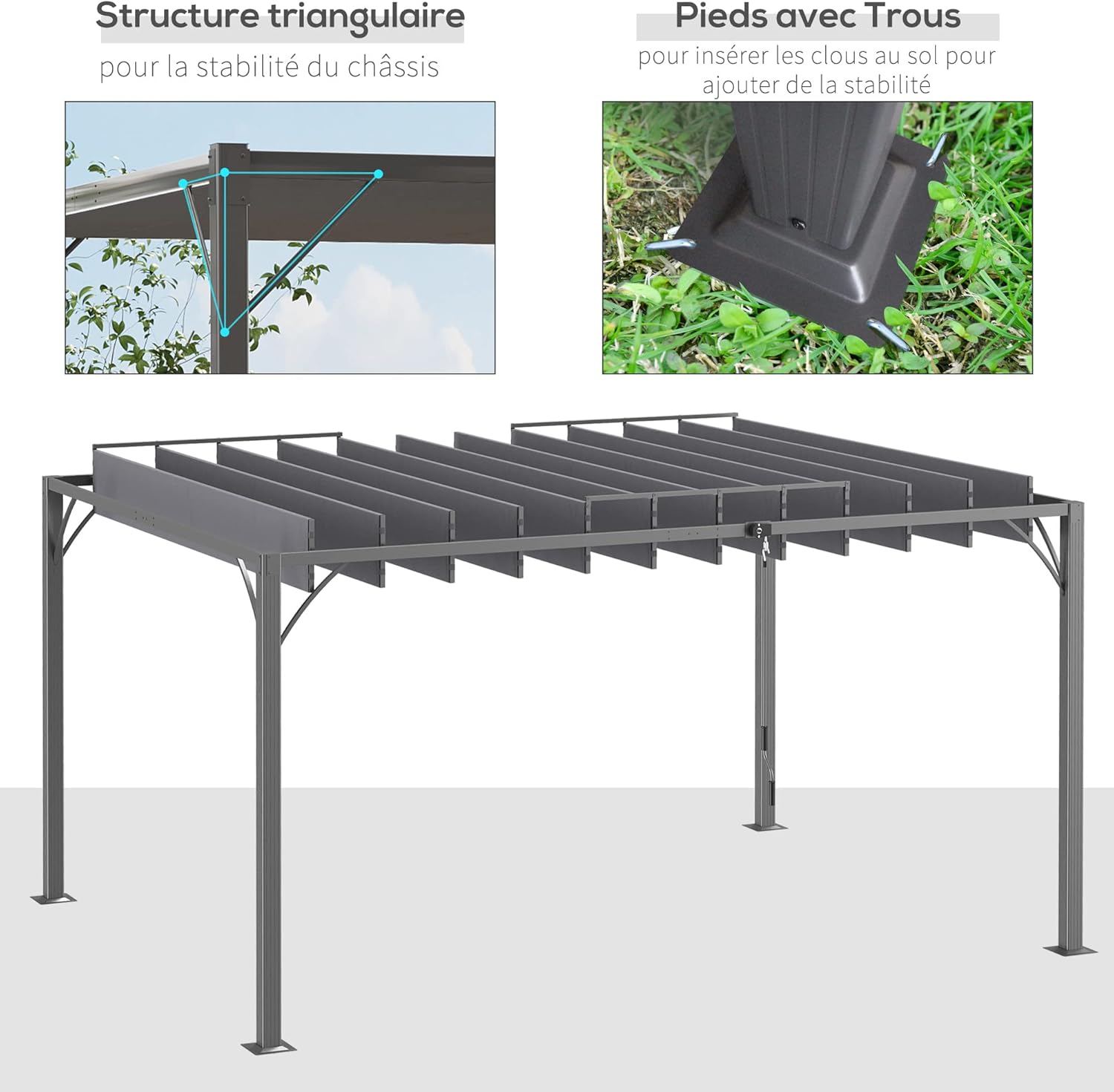 STRUCTURE SOLIDE ET DURABLE : Pergola conçue à partir d’aluminium traité époxy et ses lames orientables en tissu 100% polyester, stable et durable pour une utilisation extérieure.