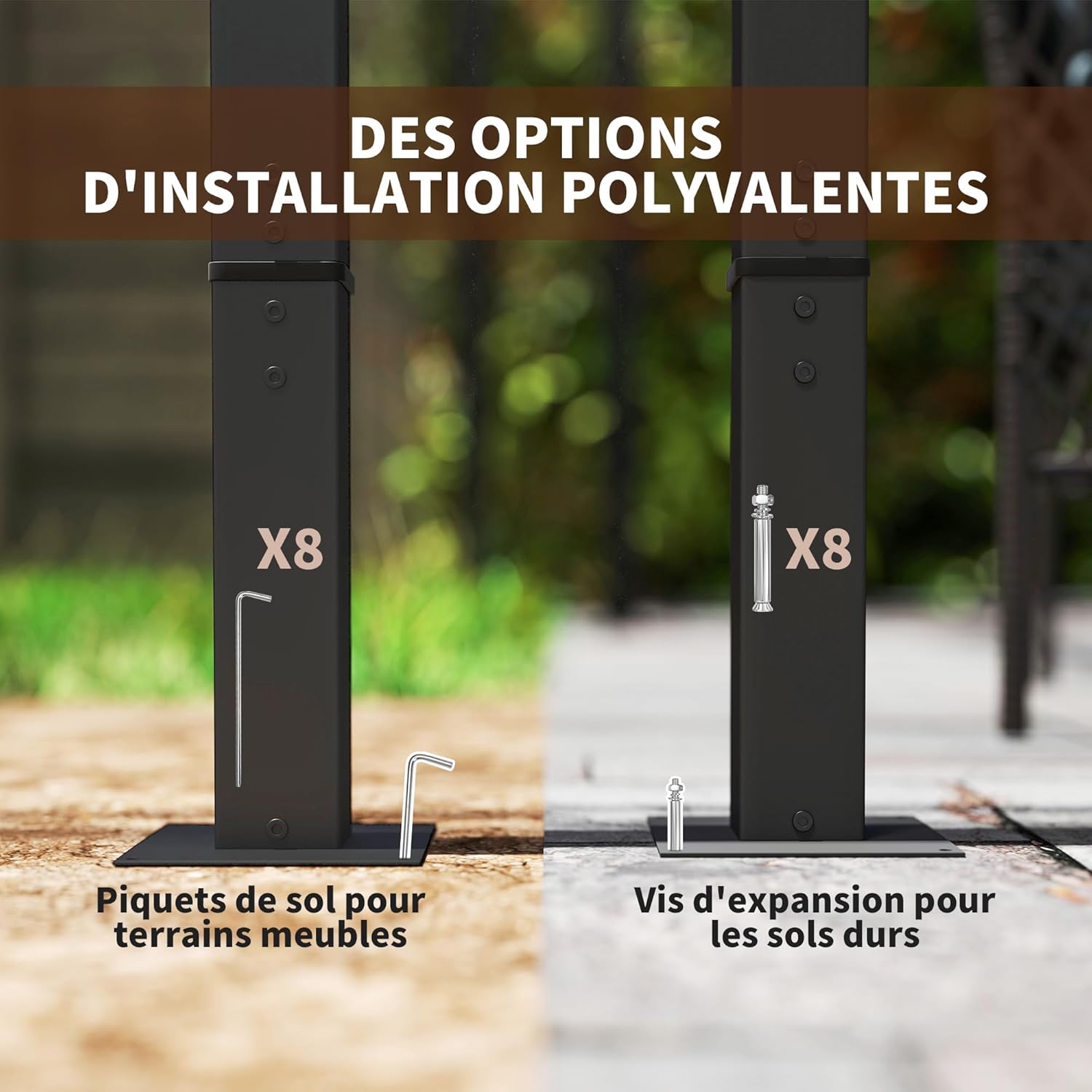 STRUCTURE MÉTALLIQUE SOLIDE : Cette pergola pour terrasse est conçue en métal avec revêtement en poudre, livrée avec huit piquets et vis d’expansion pour une fixation stable sur toutes surfaces