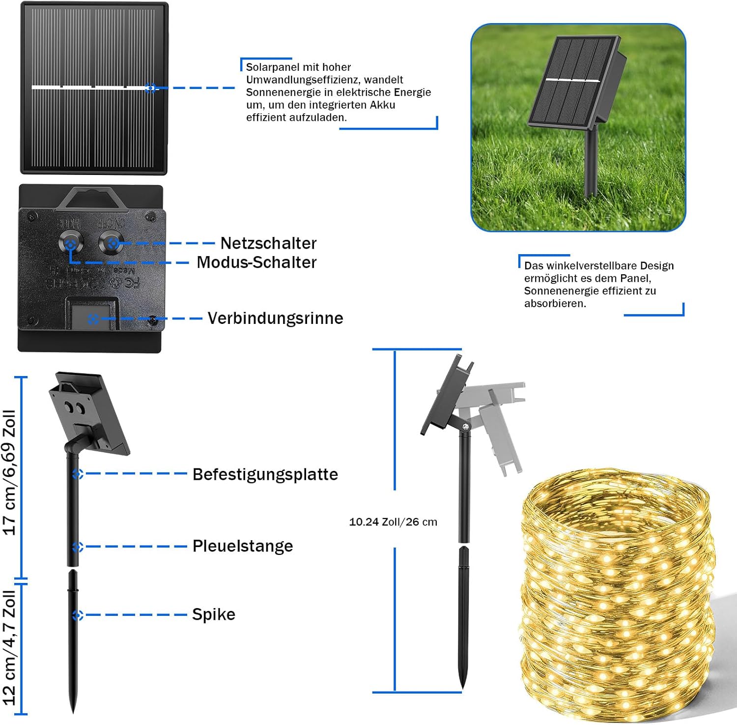 Guirlande lumineuse solaire avec marche/arrêt automatique: la guirlande lumineuse solaire extérieur a mis à jour la taille et le taux de conversion du panneau solaire et de la batterie et vous apporte plus de 8 à 10 heures de lumière la nuit si le panneau solaire absorbe suffisamment de soleil pendant environ 8 heures.
