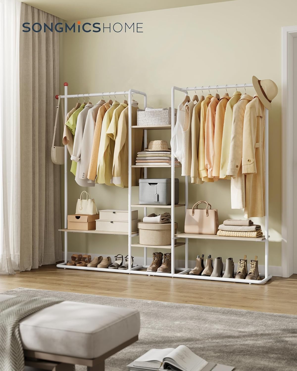 【GRANDE CAPACITÉ】Ce portant à vêtement de dimensions 33,8 x 163,6 x 175,3 cm est équipé de 2 tringles supérieures, de 6 étagères et de 2 crochets en forme d’allumettes, offrant un espace généreux pour ranger vos affaires du quotidien de manière organisée