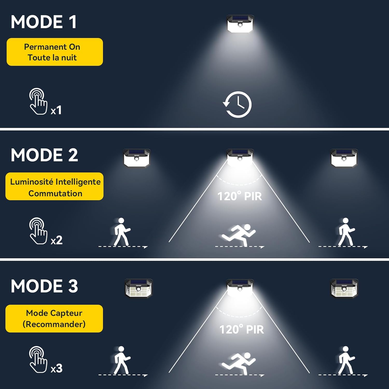 【Capteur PIR Précis】Avec un capteur de mouvement PIR ultra-sensible capable de détecter les mouvements dans une plage de 3-5m et un angle de 120°, cette lampe solaire extérieur peut détecter les mouvements humains/animales/automobiles plus sensiblement que d’autres lampes solaires LED disponibles sur le marché, offrant plus de confort et de sécurité à votre vie.