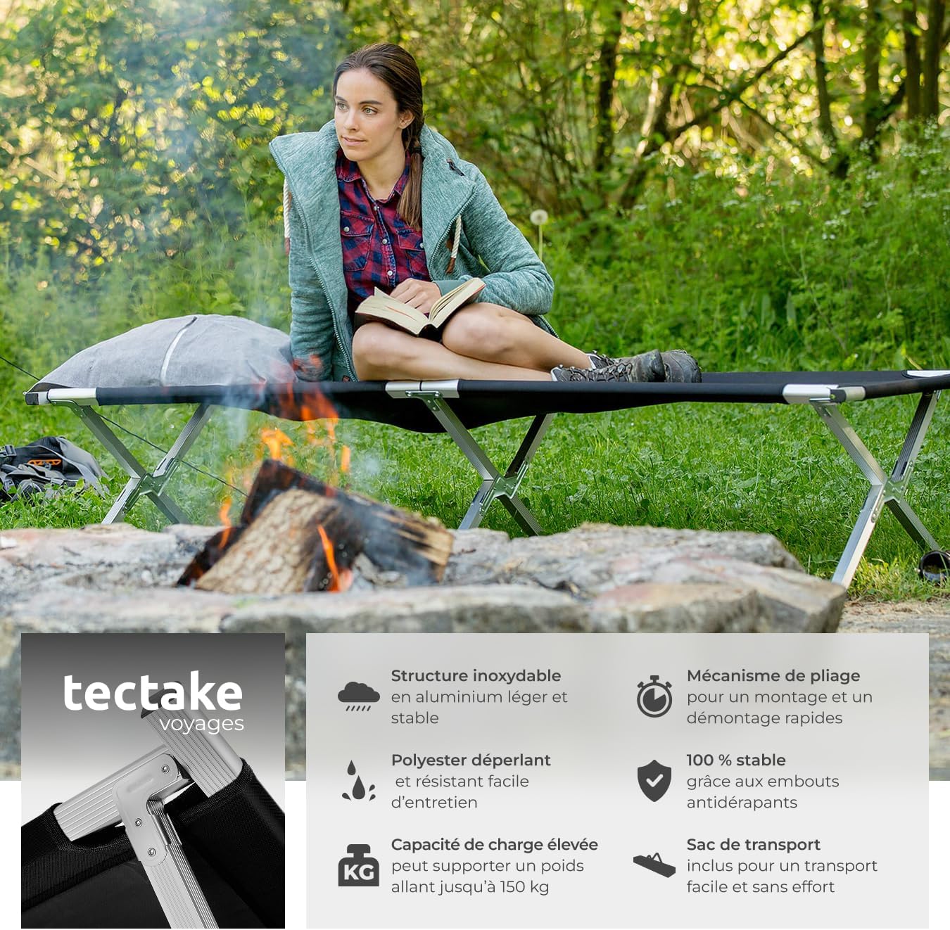 UNE CONSTRUCTION ROBUSTE QUI GARANTIT FIABILITÉ ET CONFORT. Ce lit d’appoint 1 personne est pensé pour durer avec sa structure métallique solide, supportant jusqu’à 150 Kg. Que vous l’utilisiez comme lit de camp ou comme lit de plage pliable, il offre stabilité et sécurité, même lors de longues nuits en extérieur. Un incontournable pour votre mobilier de camping fiable et pratique.