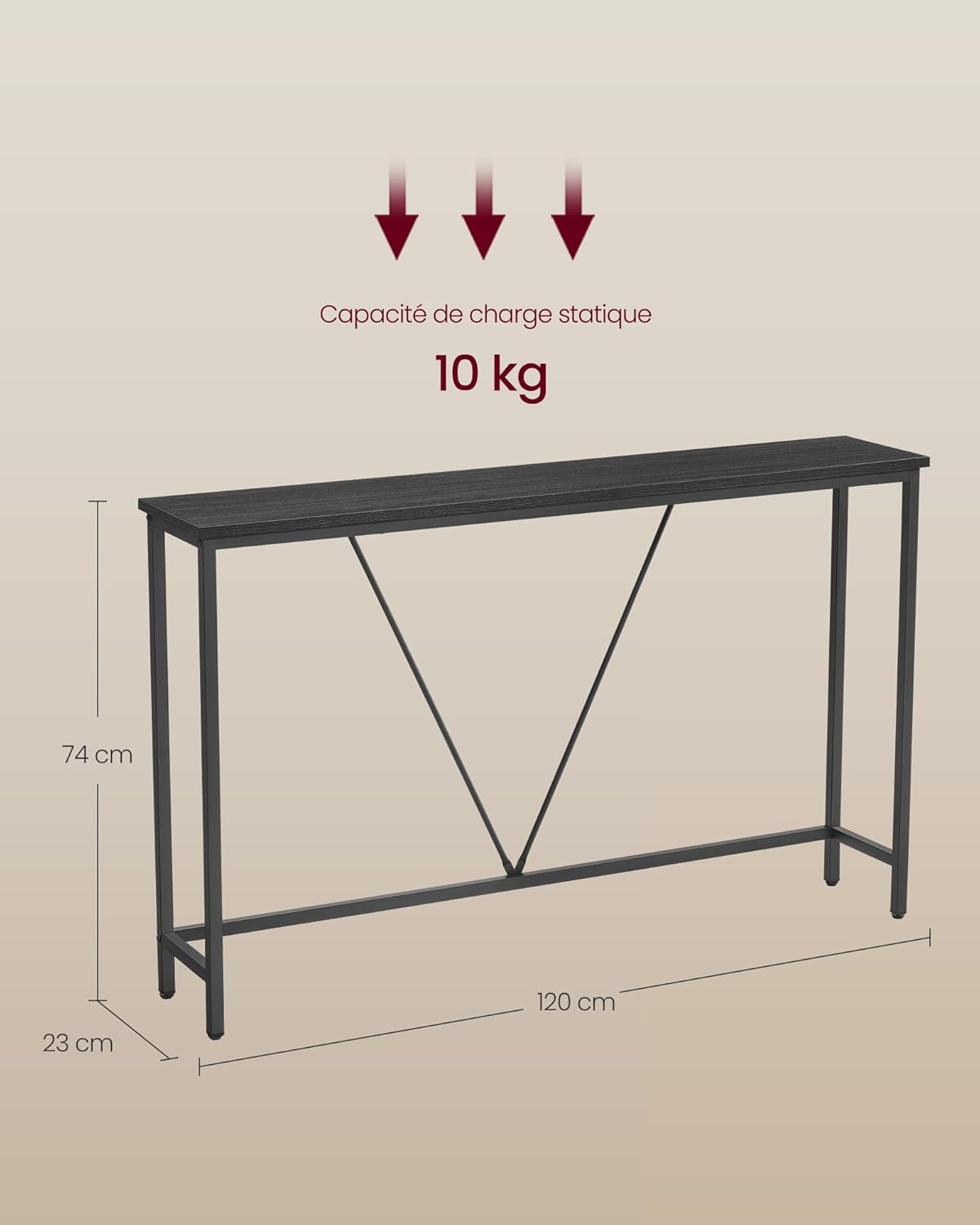 【CONÇUE POUR DURER】De dimensions 23 x 120 x 74 cm, cette table étroite associe un panneau d’aggloméré robuste à un cadre en acier renforcé. Ses pieds réglables assurent sa stabilité et supportent en toute confiance des vases lourds et de grande taille