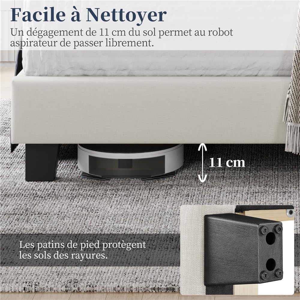 Lit rembourré confortable : la tête de lit rembourrée de ce lit double est remplie de mousse haute densité et offre un confort doux. Le rembourrage aspect lin est respirant et vous invite à vous détendre confortablement sur le lit.