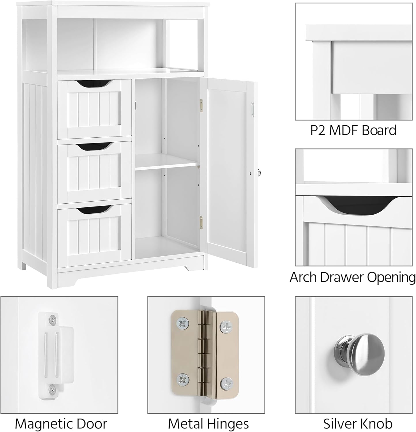 HAUTEUR RÉGLABLE DE TABLETTE: L’étagère intérieure du placard peut être déplacée de haut en bas en fonction des différentes tailles des articles. Les 3 hauteurs différentes sont disponibles pour votre confort.